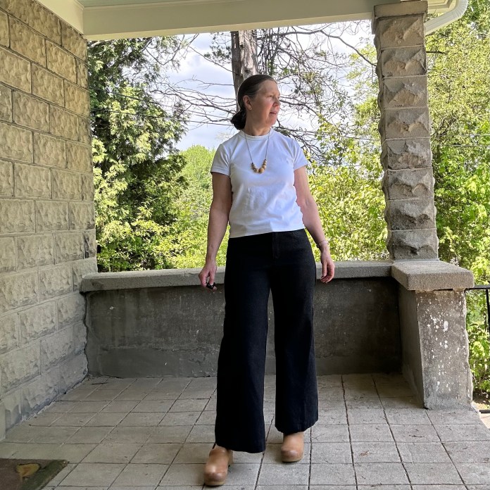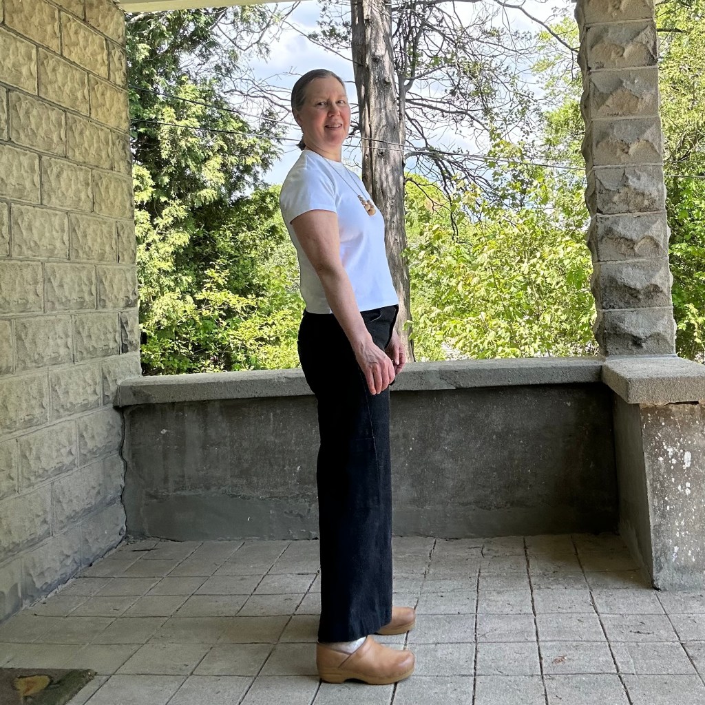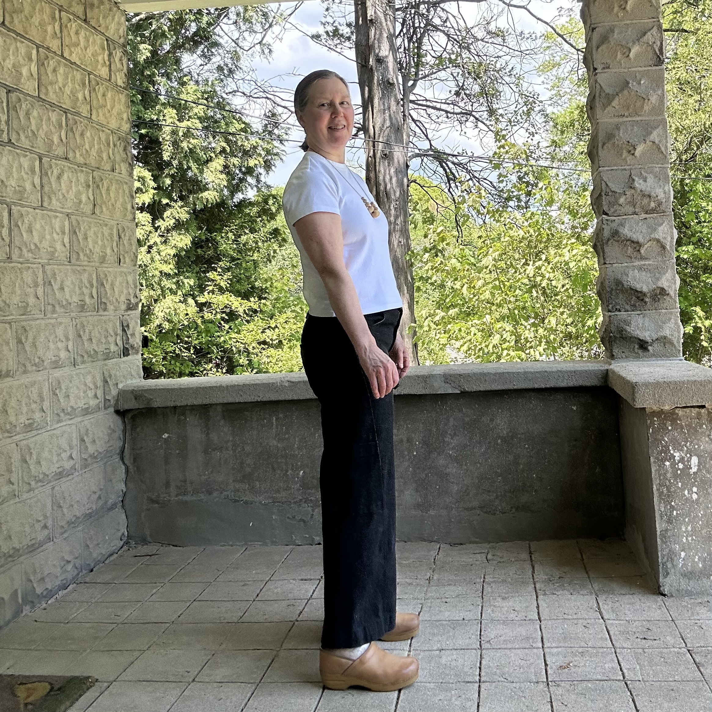 Next I altered/finished a True Bias Nikko top that I sewed during the Christmas holidays. I cut and sewed my regular size but had never used the sleeves and it was too tight across the back and the shoulders puckered and I thought all was lost but I took a chance and just cut off the sleeves and used bands to hem the armholes and I love it (worn here with Lander cropped cords I sewed in 2020.)