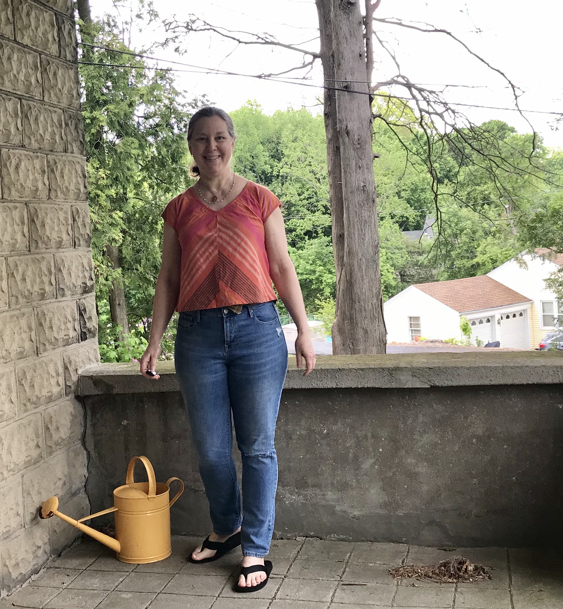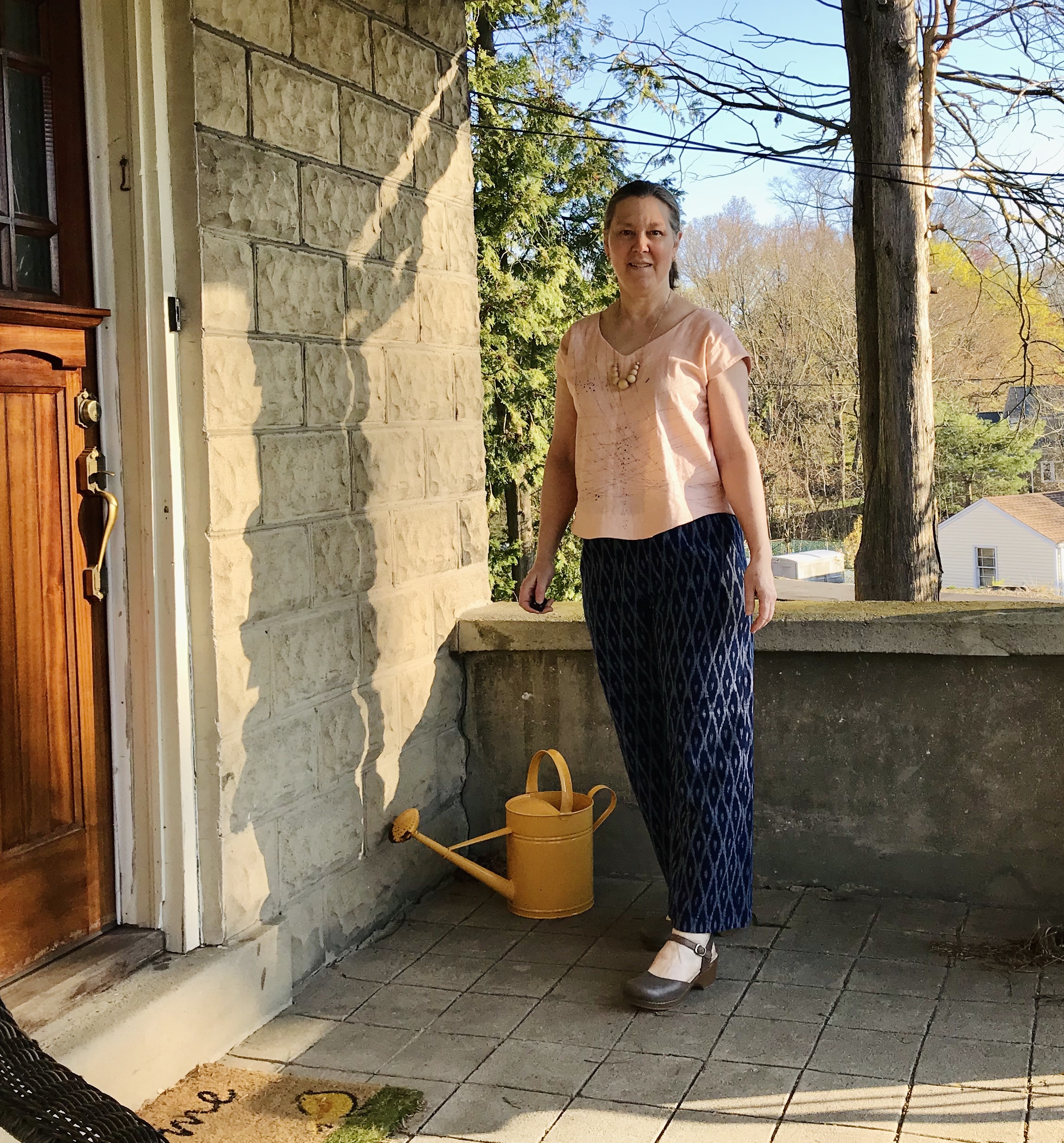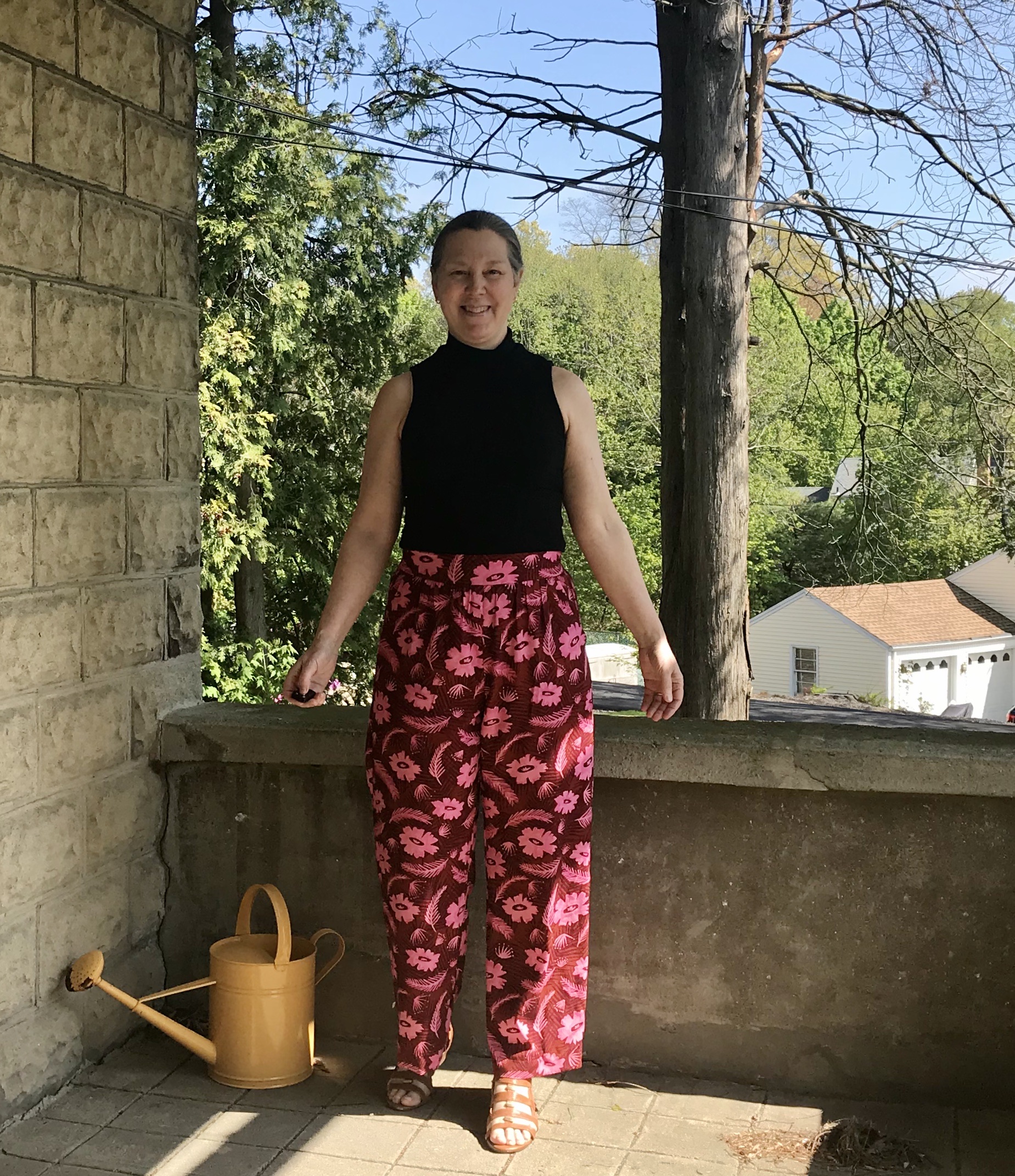 Next I altered/finished a True Bias Nikko top that I sewed during the Christmas holidays. I cut and sewed my regular size but had never used the sleeves and it was too tight across the back and the shoulders puckered and I thought all was lost but I took a chance and just cut off the sleeves and used bands to hem the armholes and I love it (worn here with Lander cropped cords I sewed in 2020.)
