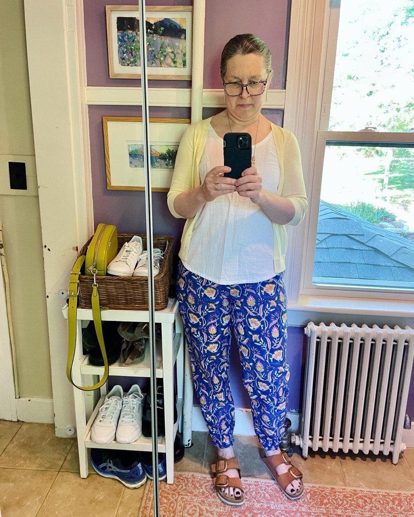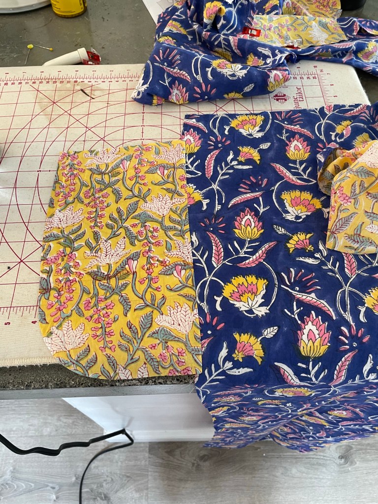 My primary goal for my weekend was to be in the moment so I decided not to take any pictures so I wouldn’t be temped to pick up my phone but I did take these two, just to document my re-entry into sewing. This is a pair of Luna pants that I cut out a year ago thinking I needed to sew something fun. I had two meters of this beautiful blue block print from Blackbird Fabrics which was just enough for the four main pieces but not enough for the pockets. I had finally, this spring, cut the pockets out of the the leftover yellow block print from my Ruby shirt, and I had brought all of the cut pieces with me. When I bring my sewing machine along on vacation, I also bring this Quilter’s ironing mat that works great on top of a table, or in this case, the kitchen counter. Ironically, the week after I got back. Love to Sew did a podcast about sewing vacations! This is my tip-so much easier to pack than an ironing board.