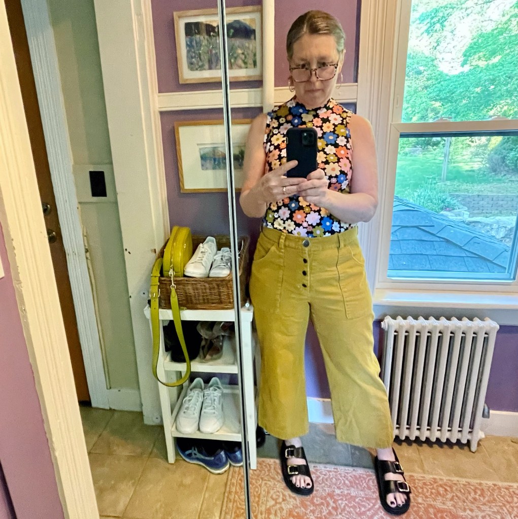 Since I last checked in I sewed a second pair of Chloe Jeans in a dark green corduroy that I have owned for five years. I think that they will be great for Fall. I have been trying to not buy fabric this year because I have accumulated so much over the years, but I did buy some brown denim to make another pair of Chloe’s for Fall. It has become a tried-and-true pattern for me. An easy sew that fits well and is cute.