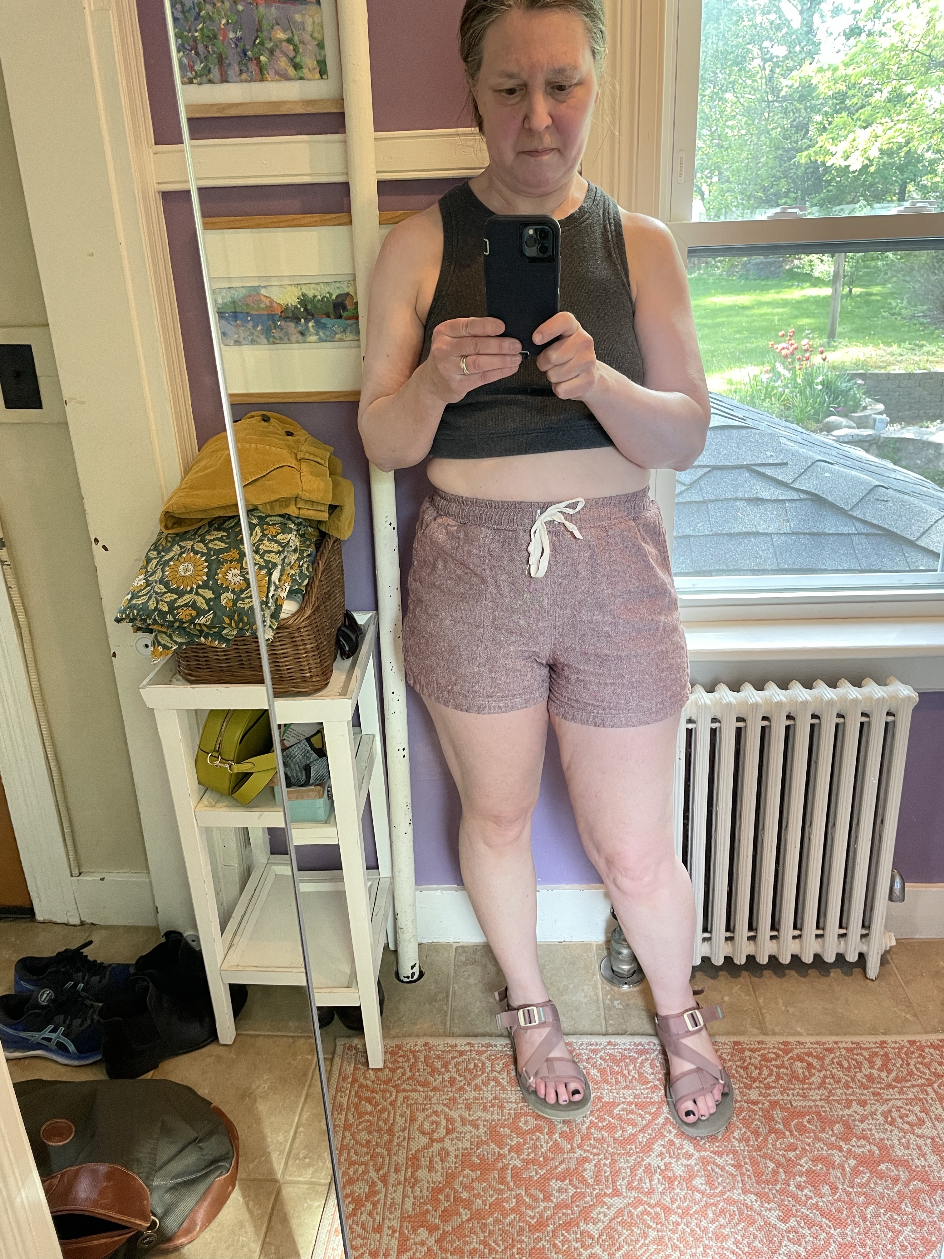 Last, I sewed up a pair of Arden shorts that I cut out last summer. I had cut out two versions of this pattern and finished the linen-cotton pair last summer (seen here with another Axis tank).