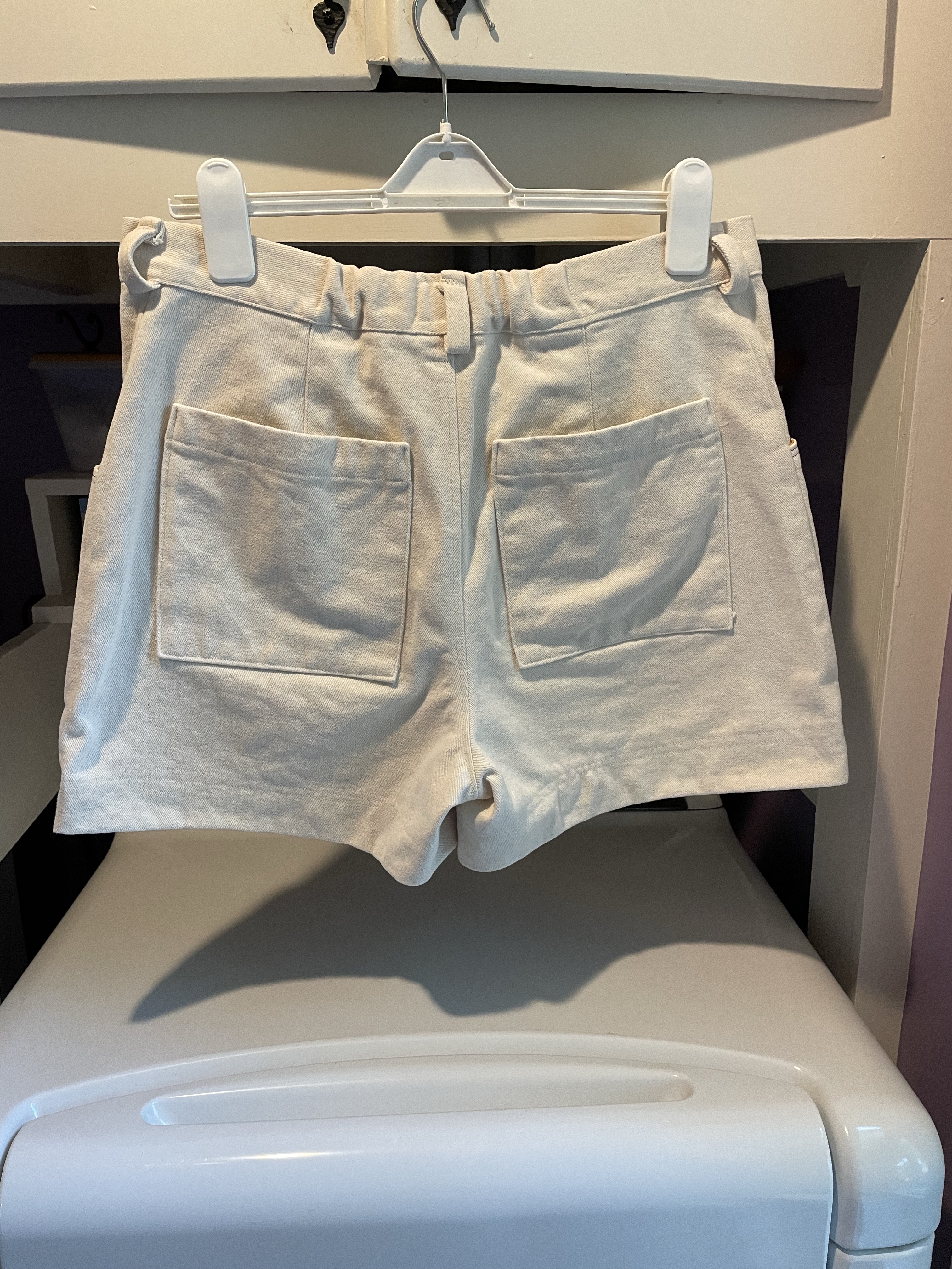 Next I finished the Lander shorts. These are sewn in a 12oz Bull denim from Blackbird Fabrics that I bought and used in 2020 to make the Clyde Jumpsuit. I had just enough left over-but had to use hem facings-something I really enjoy doing for the pop of color. It has some stretch and is super comfortable but very heavy to sew with. I broke at least 3 sewing needles attaching the belt loops but worth it. The buttons are from Joanne’s. Worn here with a Made by Rae Jade top. I add elastic just between to two back darts to help the fit. It really works well for me.
