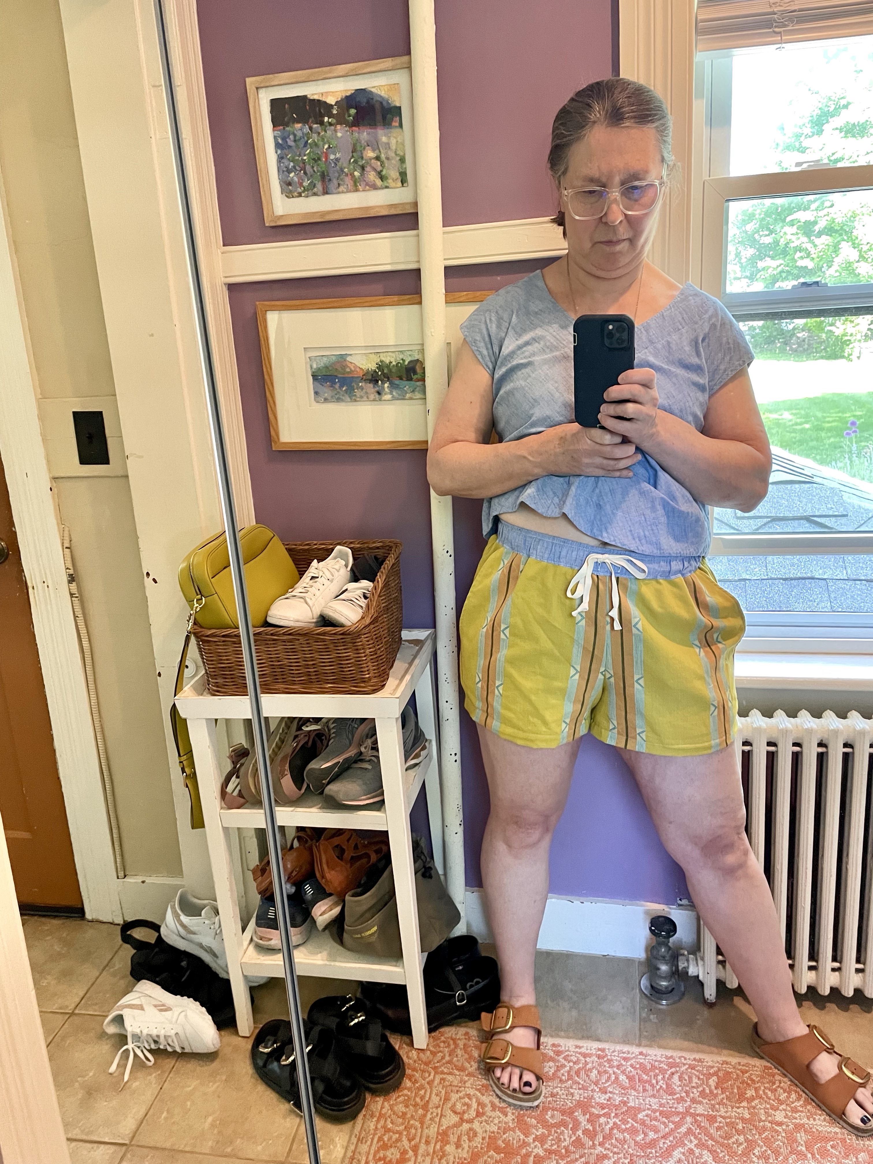 They don’t fit me as well as the Landers or the Made by Rae Rose shorts so I don’t think I will be making them again but they were already cut out and so I decided to finish them. I tried to just enjoy the process of sewing them and ended up deciding to use a contrasting waistband. I still don’t love the fit but they will be fine to pull on over a bathing suit or to wear at the house on hot nights. No regrets that I sewed them up. Sometimes it helps to have low-stakes projects to sew when you are getting back into sewing after a long break.