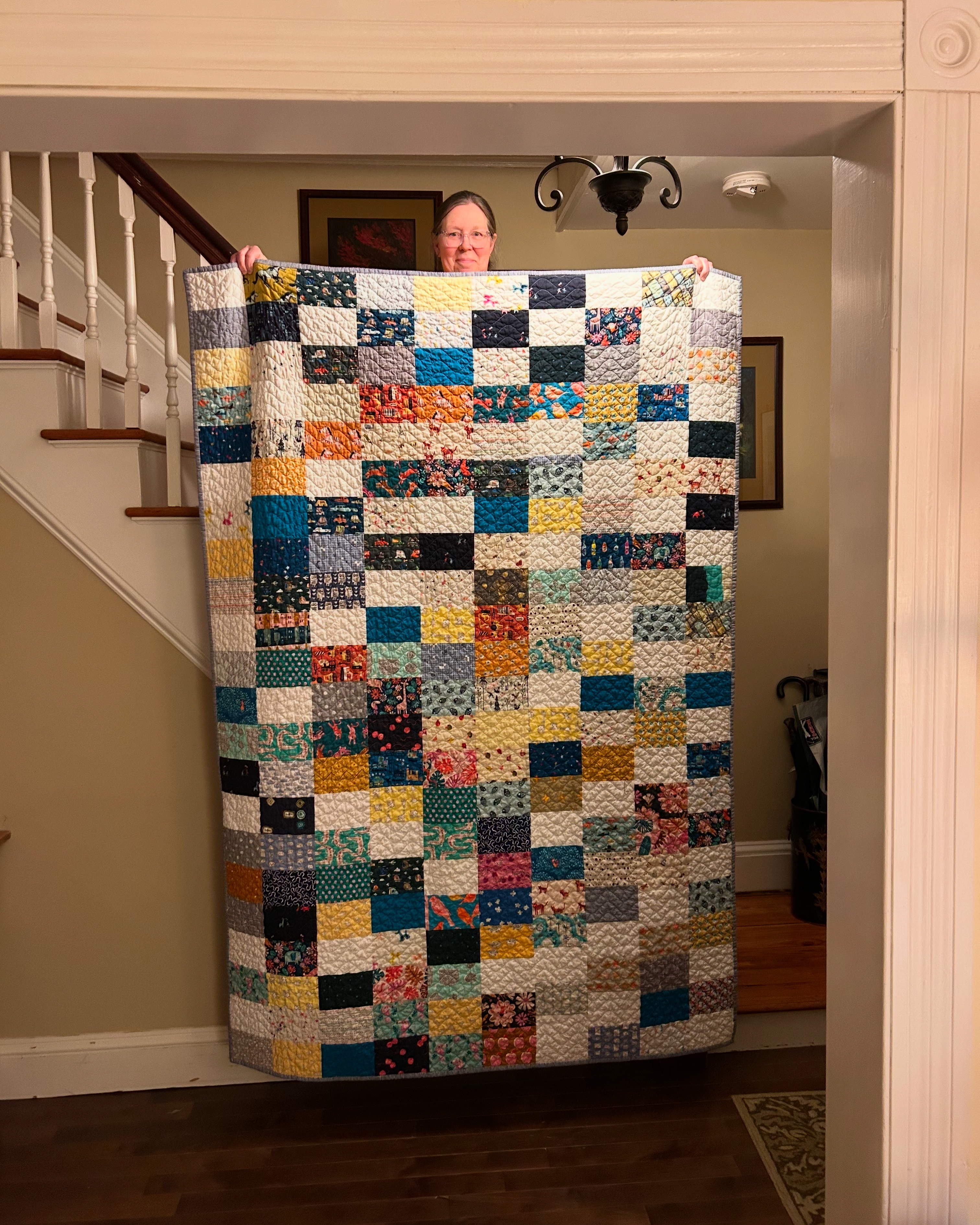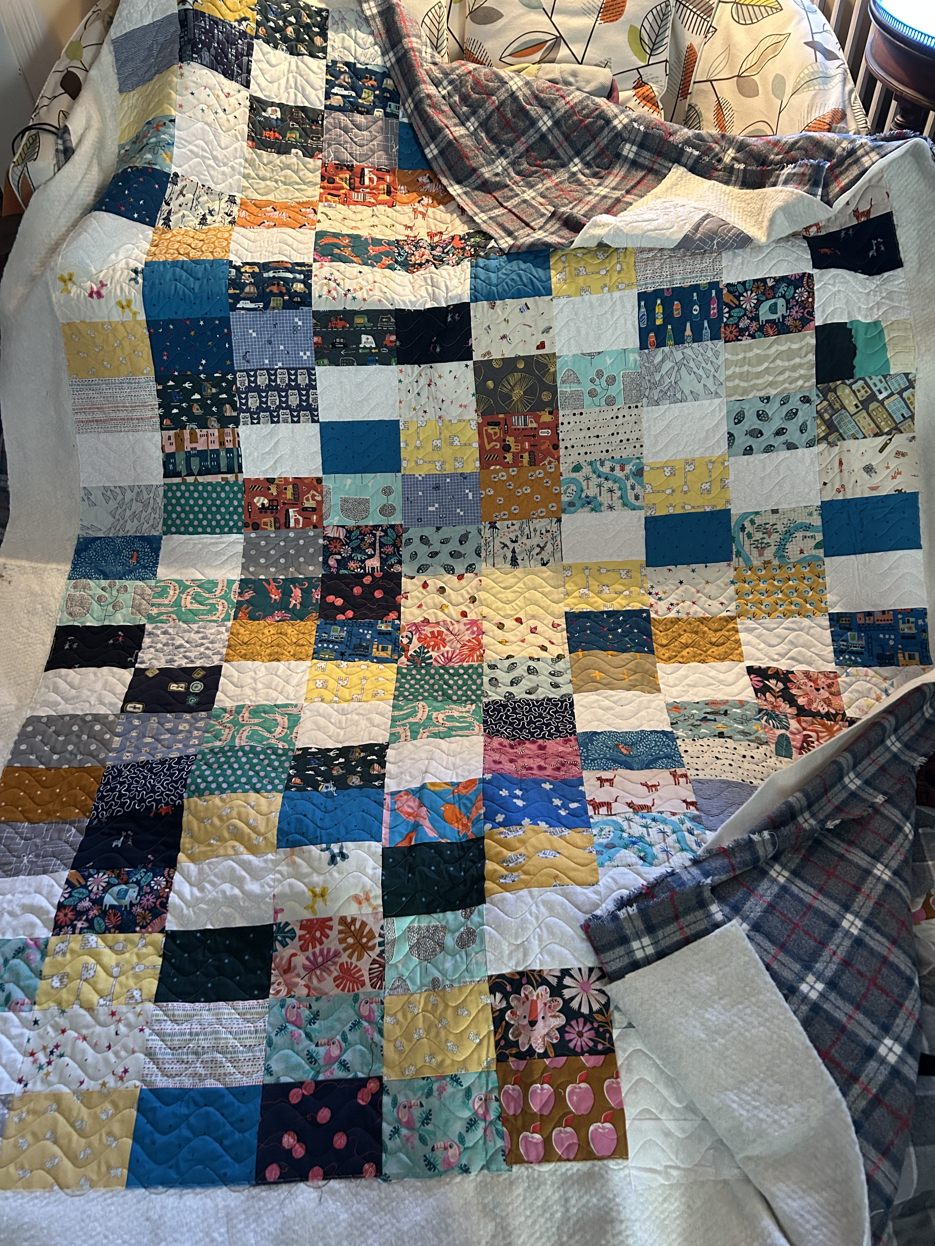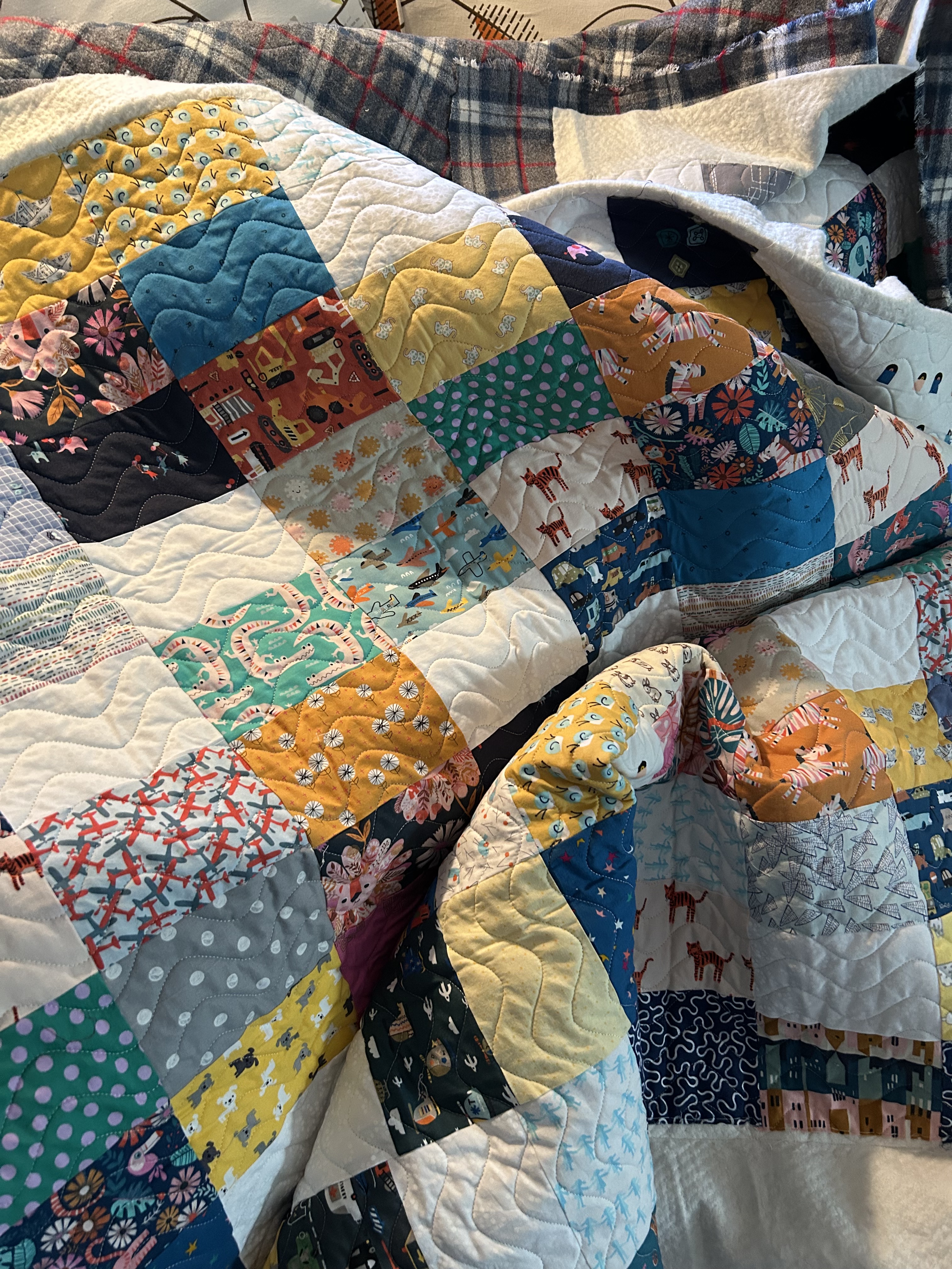 Finally, I finished two scrap quilts that I wanted to sew for the beds my grandsons will sleep on when they visit. I worked on these a bit at a time. I had lots of quilting cotton left over from various projects and I wanted to sew these up while the kids are young enough to enjoy the designs. I cut strips 6.5 inches wide with my quilting ruler and then sliced them into 6.5 X 4.5 inch rectangles and then when I had time, I would sew a strip of 22 of them. The final quilts were 10 strips wide. One strip of precut rectangles takes me about 30 minutes to sew so I was able to do this in easy chunks as a study break this winter when I was too busy to tackle any more complicated projects. I sent them to be longarm quilted and backed them heavyweight cotton plaid. The kids don’t know that I made them so it will be a surprise. I expect that they will probably go home with them to the Midwest and if that is the case, I plan to make more of these to have in the house when kids visit. It was a fun and satisfying sew and sending them off to be long-armed made all the difference. I used a pattern called Domestic Waves. the longarm quilter is Wild Phil Quilting (highly recommend) and I love the post-wash crinkle (see photo above. The pictures below are before washing so you can see the design. Would use this one again. It is great with the straight lines of the rectangles.)