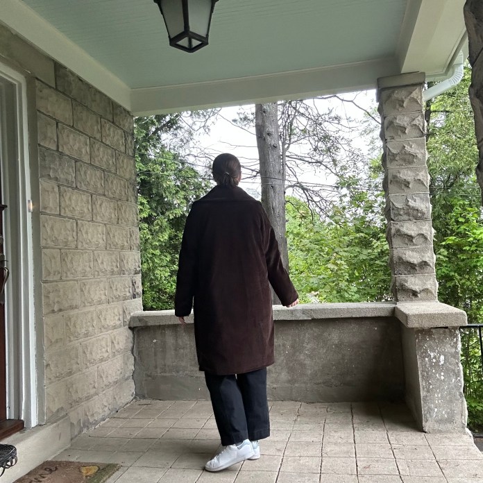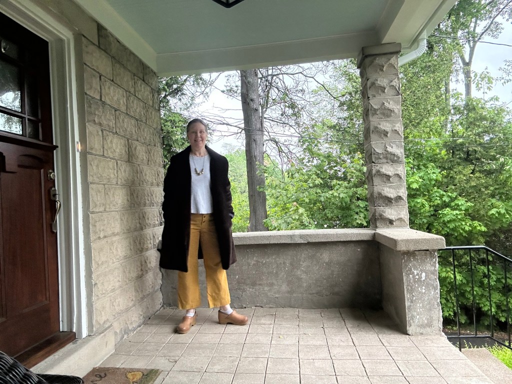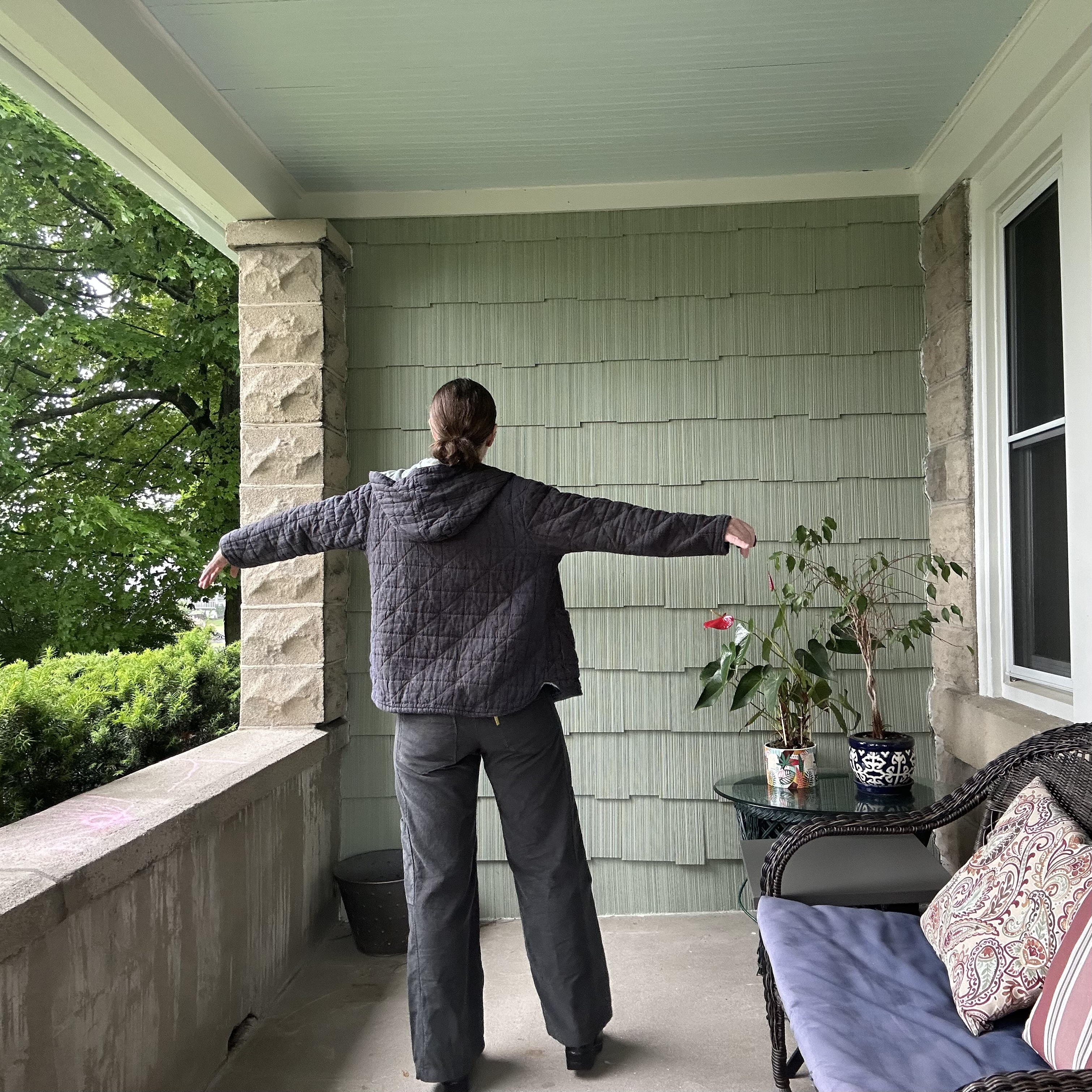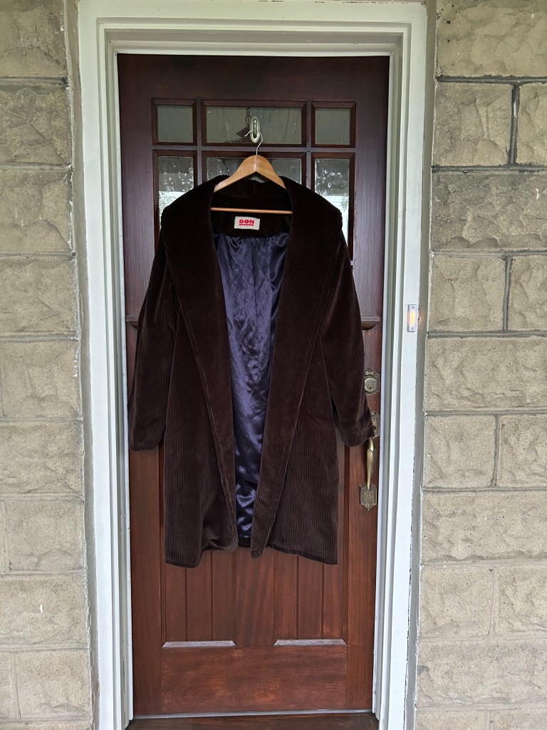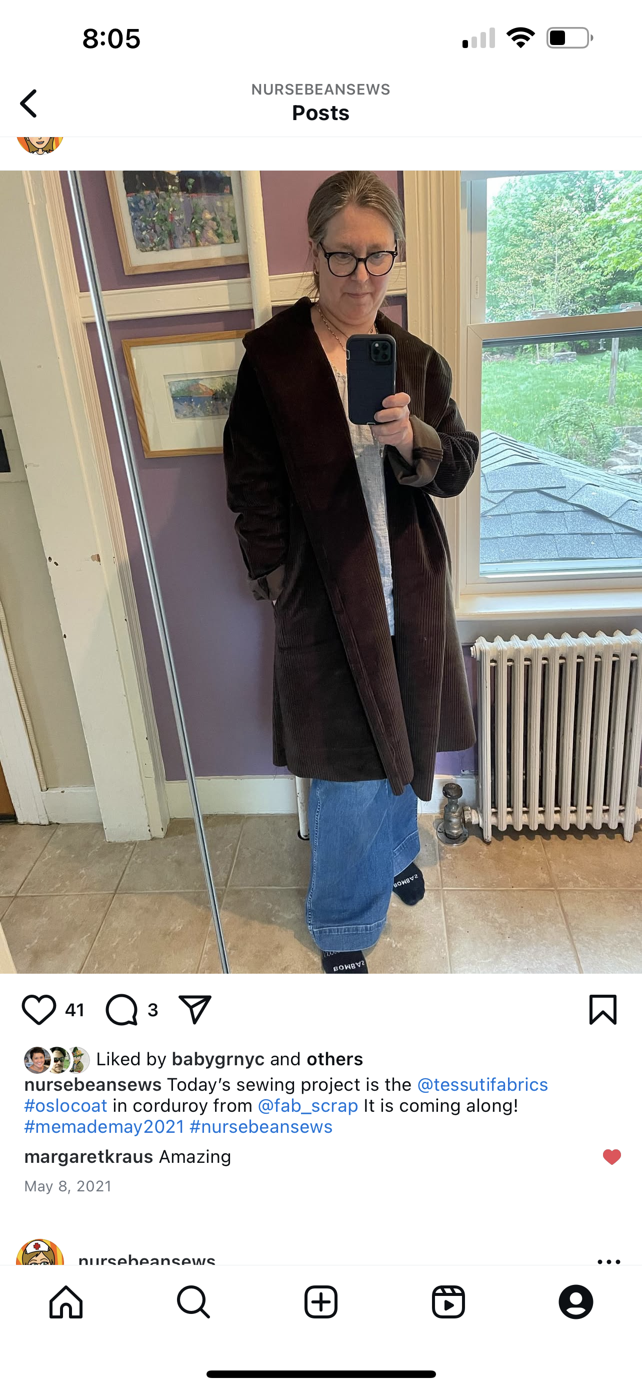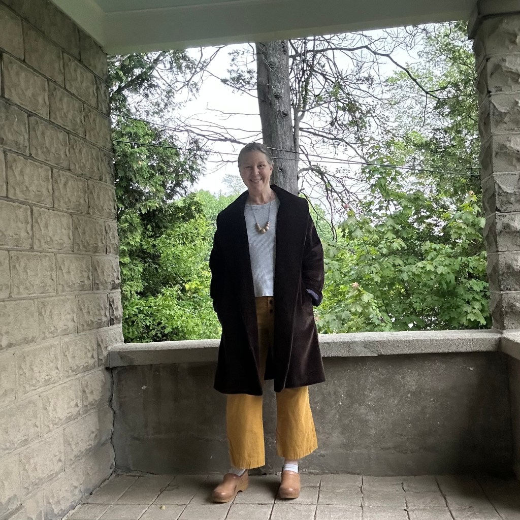 This month I finished a long-time WIP: a corduroy Oslo coat which I have been working on for several years. It was inspired by a brown corduroy coat that I love and still wear, 26 years after buying it in New York. This was a challenging sew. I had a plan for a quilted lining but after sewing it, I scrapped it because it was too stiff. The unfinished coat sat in my sewing room for literally years until Blackbird Fabrics had a navy flannel back lining fabric on sale which called my name. The coat is full of mistakes, but I love it, and it feels great on, and I know I will wear it all the time next Fall. Here are some pictures that don’t do it justice. I love the pattern that the corduroy makes on the shawl collar. I sewed whatever the largest size was: 16 maybe? and added 3 inches to the length and 2 to the sleeves which ended up possibly too long, but I like them with the sleeve turned back so you can see the lining. I expect to wear it over jeans as my noodling around NYC Fall coat.