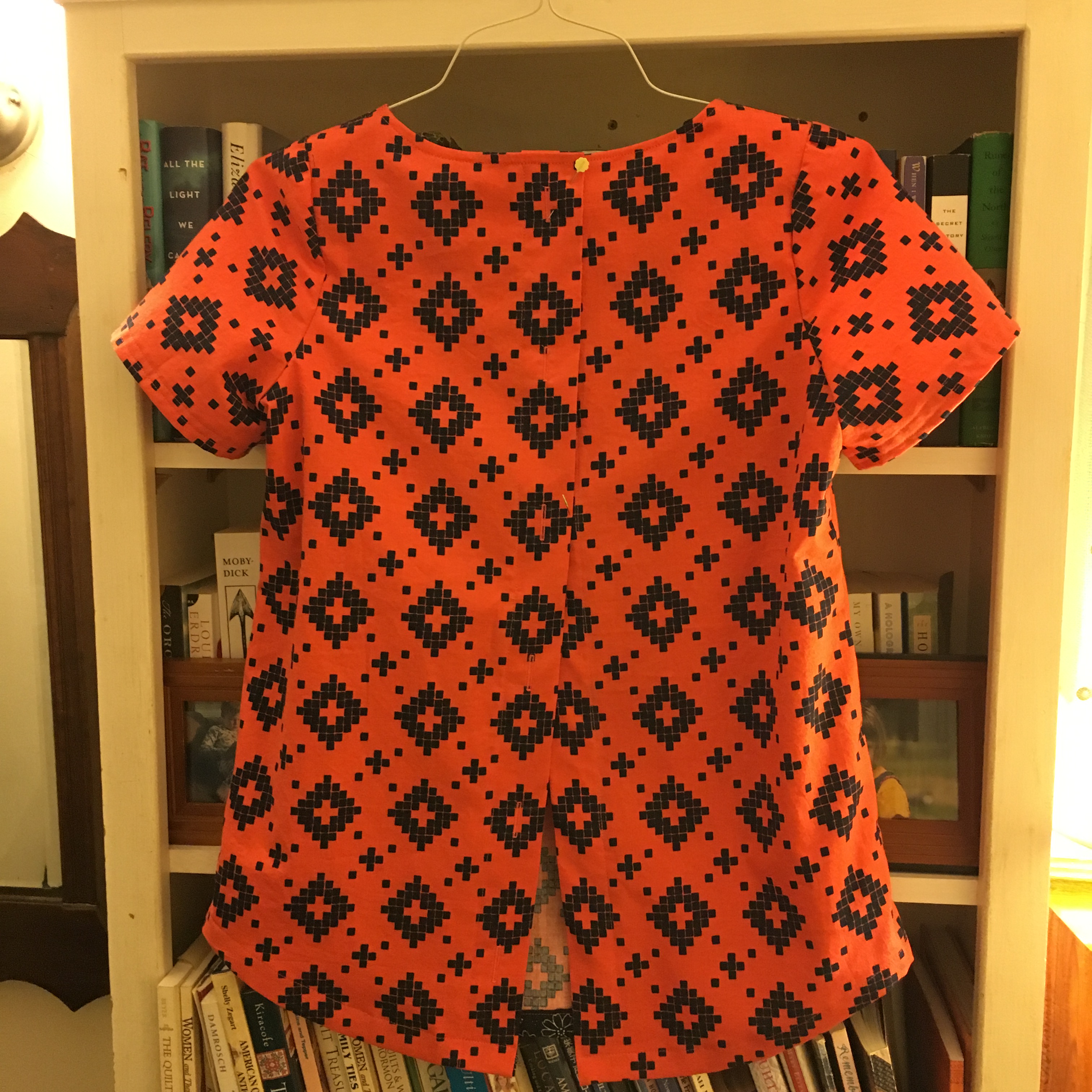 I have made two sleeveless Beatrix blouses and one with three quarter sleeves, all blogged here. More recently, I made a pair of short sleeved blouses using beautiful Cotton and Steel fabric. They are great worn with corduroys. I made a size M and added two inches to the length and made a small hollow chest adjustment by folding the pattern when I cut out the front.