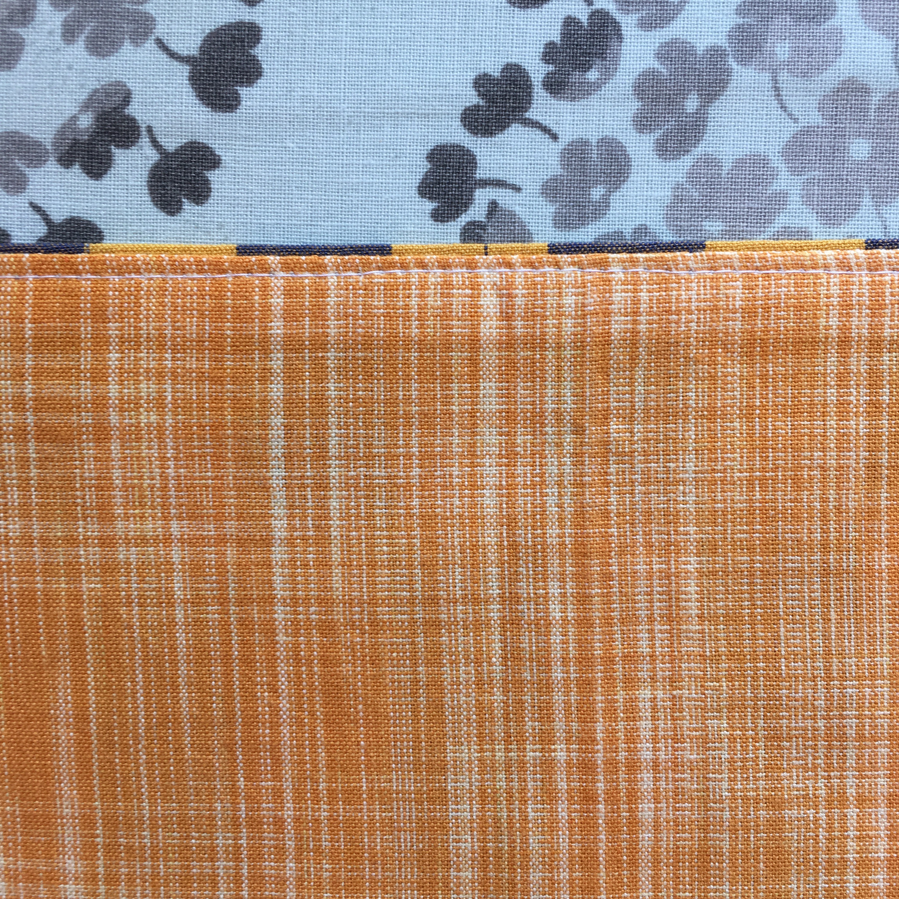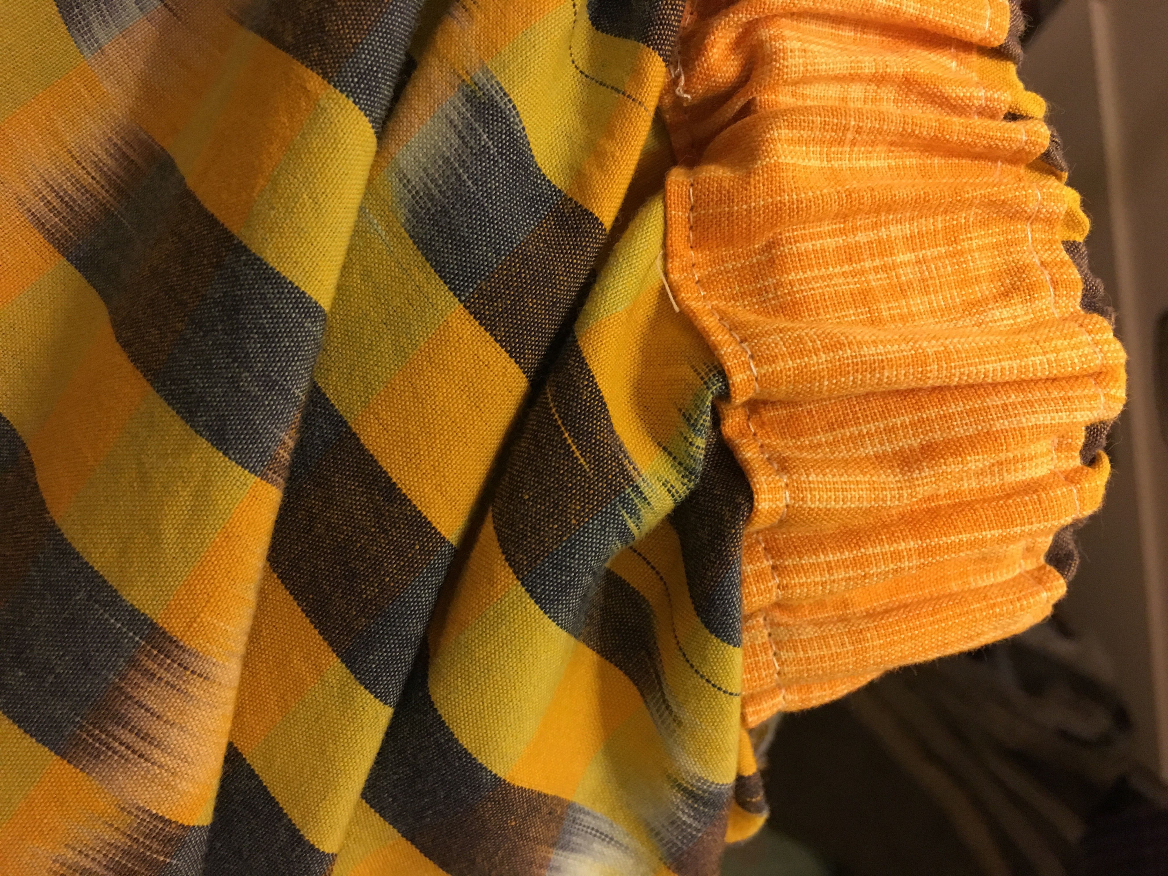 I cut the pockets with the grain because that made the best use of the fabric I had left after cutting the main pieces. One could also cut contrasting pockets but I only had a half a yard of the yellow.