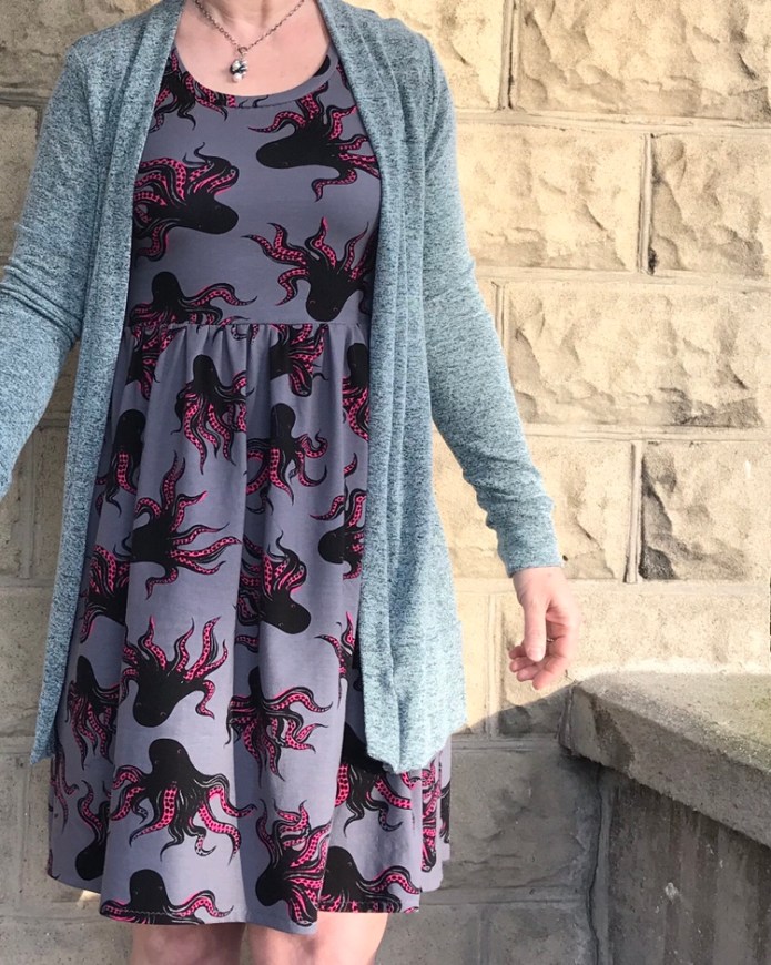I have a couple of other versions planned, one in the same grey and white striped Cloud 9 knit that I used for the Jade top. Stay tuned. I also sewed up an Isla in awesome Cotton and Steel octopus fabric which I finally found at Alewives Fabrics after searching the internet (I think it was so popular that it is sold out at many stores). I am glad I persevered because I love it as an Isla. I didn’t have enough for sleeves but I like it as is. Sleeves might be too many octopi; although is that a thing?