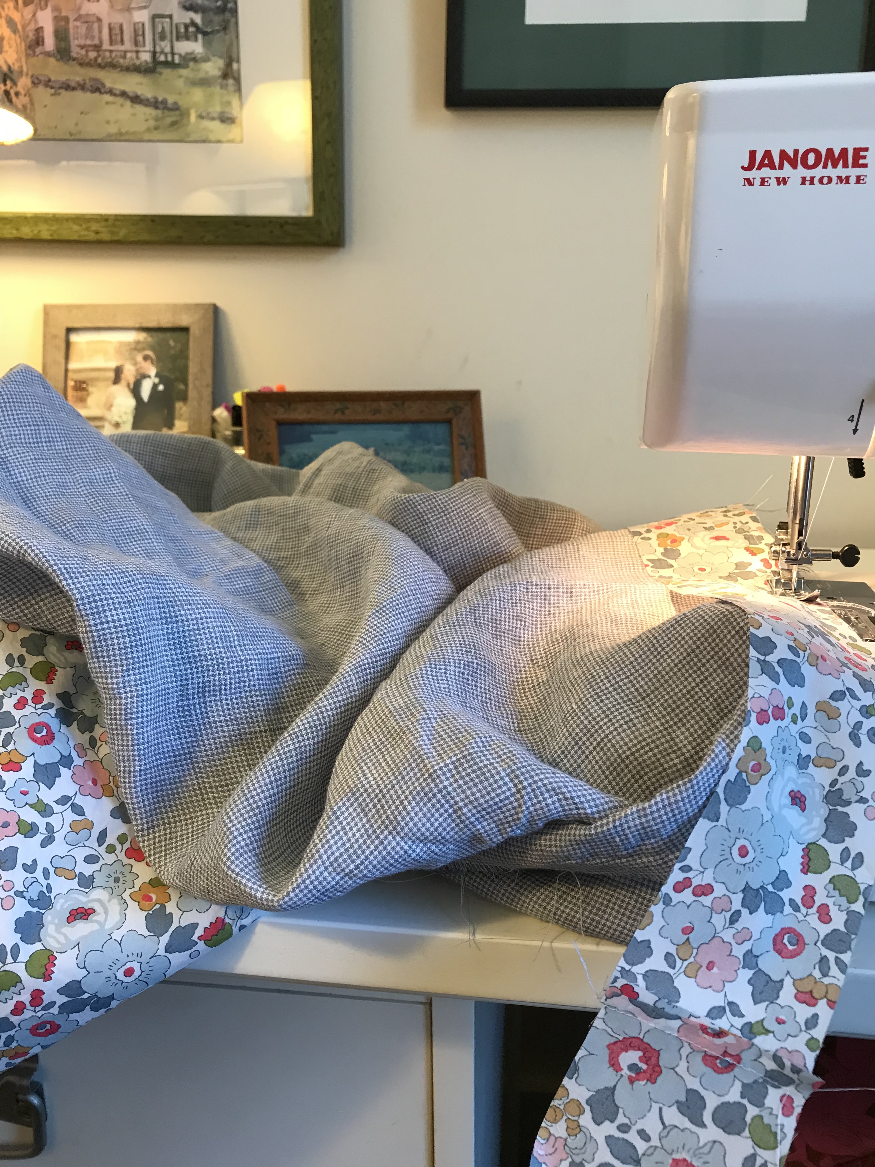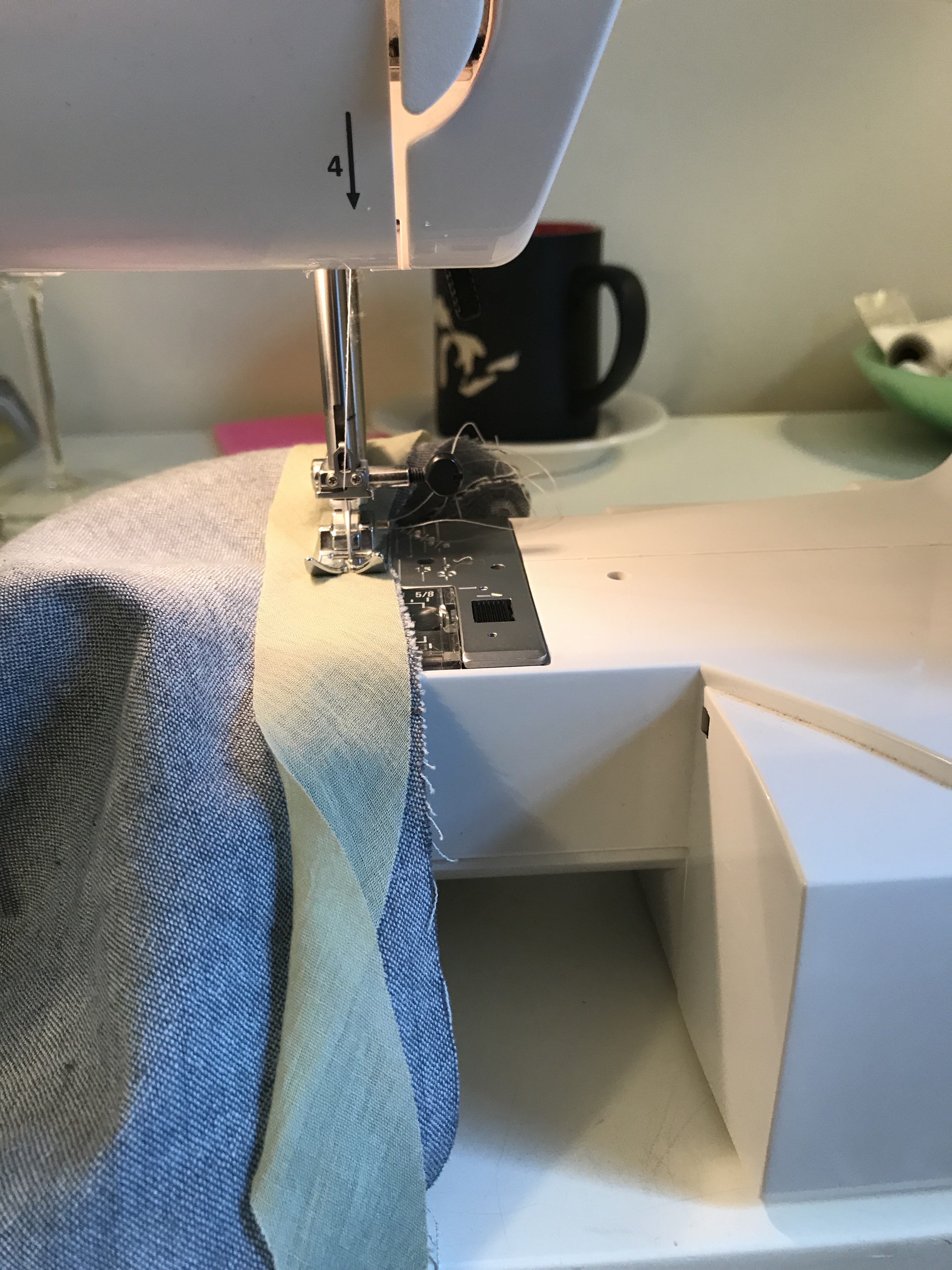 I ended up taking out a few stitches, opening up the waistband to be able to close the safety pin and then I sewed it back up after we finished threading it through (culprit below). I need stronger reading glasses for close sewing work but in a pinch, doubling up on my regular reading glasses works.