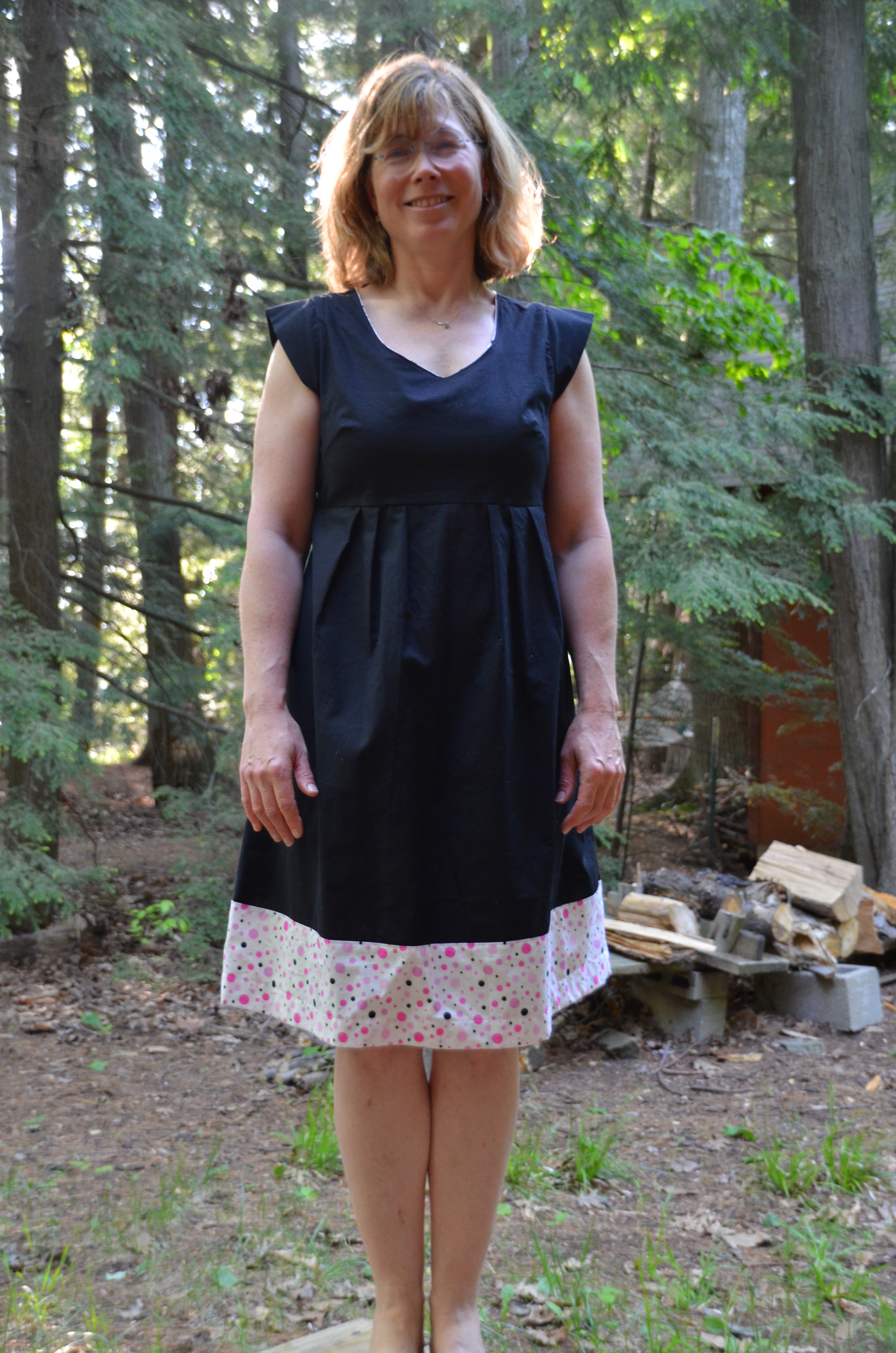 This is the before picture.imageWhen I made my first Washi Dress last winter, I didn’t have enough fabric and ended up adding a strip of a different fabric as a border. I was really happy with the result. I was new to this sewing business and if you look closely you can see that I didn’t match up the seams on the main part of the dress and the border but to be honest, it doesn’t even matter. It is cute. I wear it all the time and I get lots of compliments. It is a tribute to Rae that even my first attempts at her patterns have turned out to be wearable and cute.imageI wanted to make the pattern again and decided to use some black quilting cotton from my stash to make a black Washi. I realized that I had enough black cotton to make almost two dresses but not quite so I decided to use a second fabric to make a contrasting band at the bottom of each skirt. I ended up making two versions: one for my daughter with polka dots and for myself, I used fabric leftover from my younger daughter’s grade school Invention Convention project,  which was a “puppymobile”. Details of the two dresses can be seen here in my original post.imageI was really happy with the effect this little change made to a basic black dress and I was happy to be able to make two dresses using fabric I already had. My sister saw the polka dot version I made for Sarah and said she really liked it. I happened to have the polka dot fabric in a different colorway so I offered to make her one.imageWhen I made my own black washi with the puppy fabric lining, I must have cut the lining a bit bigger than the bodice pieces for the dress dress and when I went to topstitch the neckline, it shifted a bit.image I ended up doing it on purpose to create the effect of piping without actually having to make piping. I did that for Madeleine’s dress as well. It is such an easy thing to do and I love the effect.imageOnce again, I used the wonderfully clear Made By Rae videos to walk me through the sausage technique to get a clean finish for the lined bodice-finished dress inside out above. Sausage in process below.imageI used the cutting lines for the Washi tunic and added several inches to create my seam line for the main part of the dress. I sewed all the side seams and added the contrasting border at the end lining up the seam in the border with the side seams of the dress.imageAfter sewing on the border, I ironed the seam and then topstitched for a more finished look and for durability, something that is important to me as I machine wash everything. Dry cleaning costs are just not in my budget.imageI am really happy with the way it turned out. The polka dots add just enough cute to be fun. imageAnd here is the finished dress which was mailed out to Michigan for the birthday girl.imageThe puppy version (slightly rumped) below. I wear it often. image