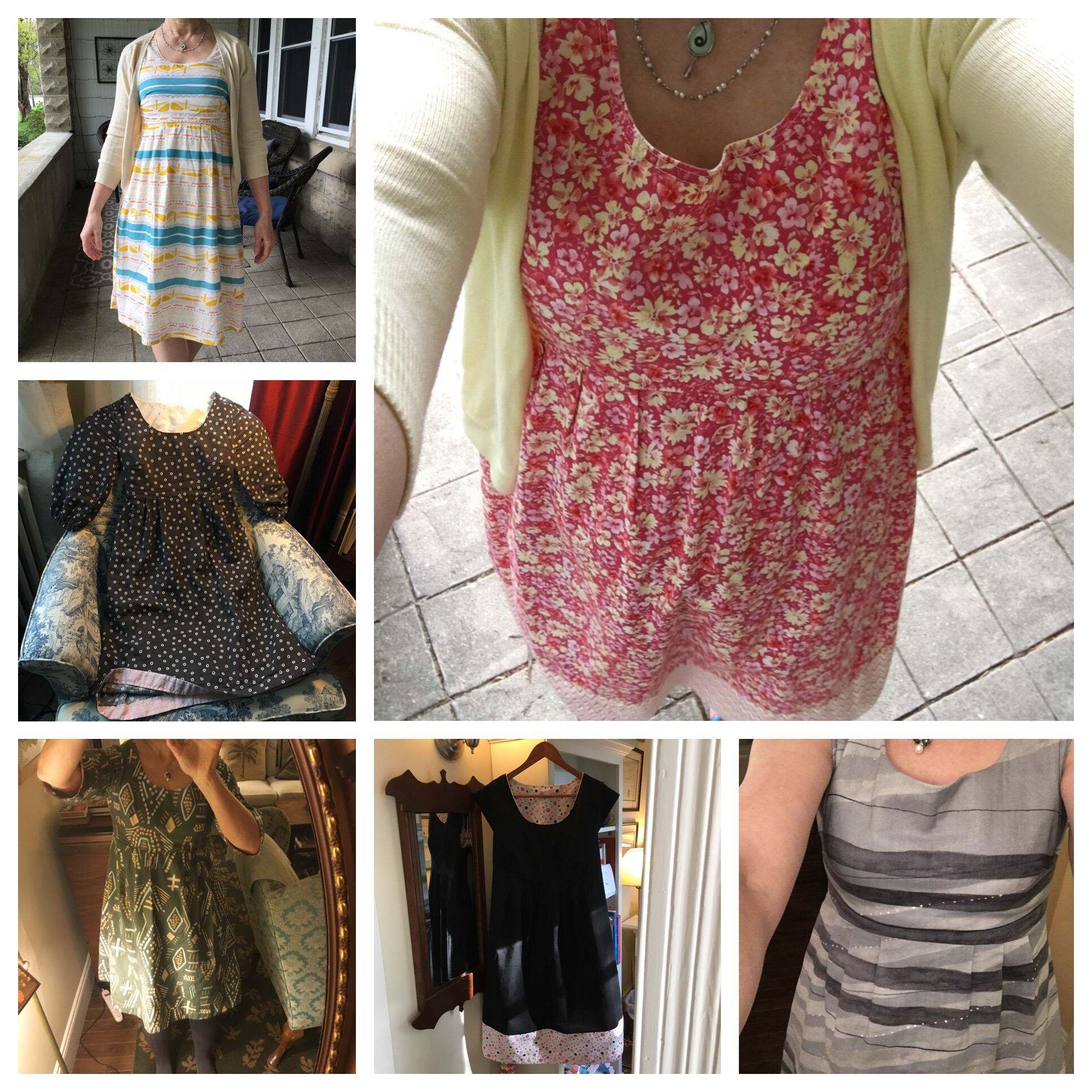 One year ago on February 7th a freak snowstorm gave me an unexpected day off and I started on a journey of sewing garments that has brought me so much fun (and a whole new me-made wardrobe) over the past year. I had sewn some children’s clothes when my kids were little and had been a quilter for many years but work and life kept me too busy for hobbies for many years and it was just this last year when life calmed down a bit that I was able to think about sewing again. And this year, for the first time, I made clothes for myself. Specifically, I made 8 Washi dresses, 5 Bianca dresses and 1 Bianca blouse, 6 Beatrix blouses: 2 of them sleeveless and one of them in a tunic length, a Pearl Shift flannel dress, 4 Ruby dresses, 1 Ruby blouse, 3 Voila blouses and 2 Pocket Skirts and a New Look 6095 Shift Dress. Three of the garments were for my daughter  and I made one pair of PJ’s for another daughter but the rest I have been wearing and enjoying all year. I have basically replaced my entire work wardrobe-slacks excluded although I don’t wear slacks very often- with garments I have sewn. Some favorites below: