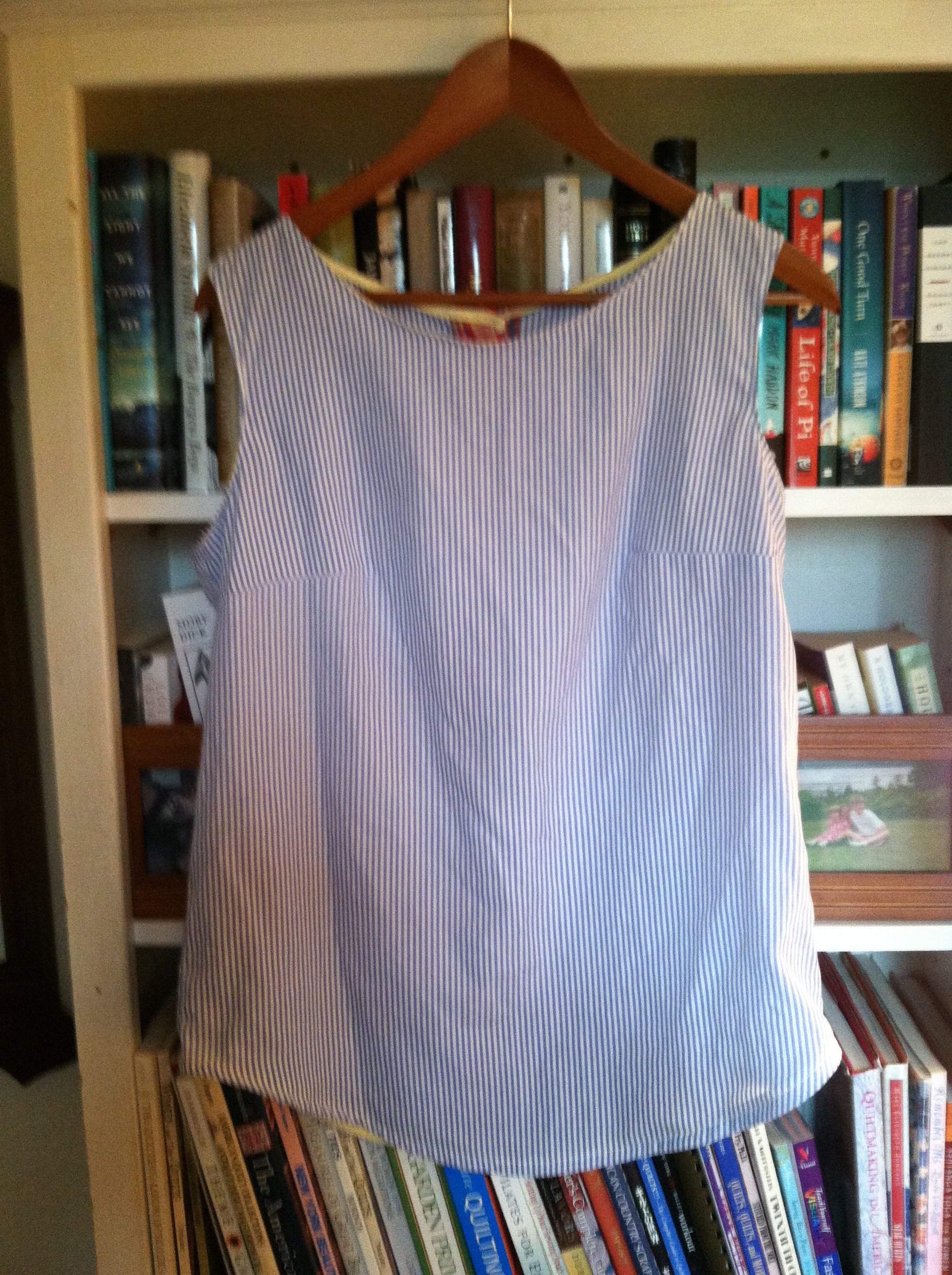 I realized that I cut the back lining piece too wide so I just sewed a center seam to take out the excess. I like to top stitch around the neckline so that everything lies flat.