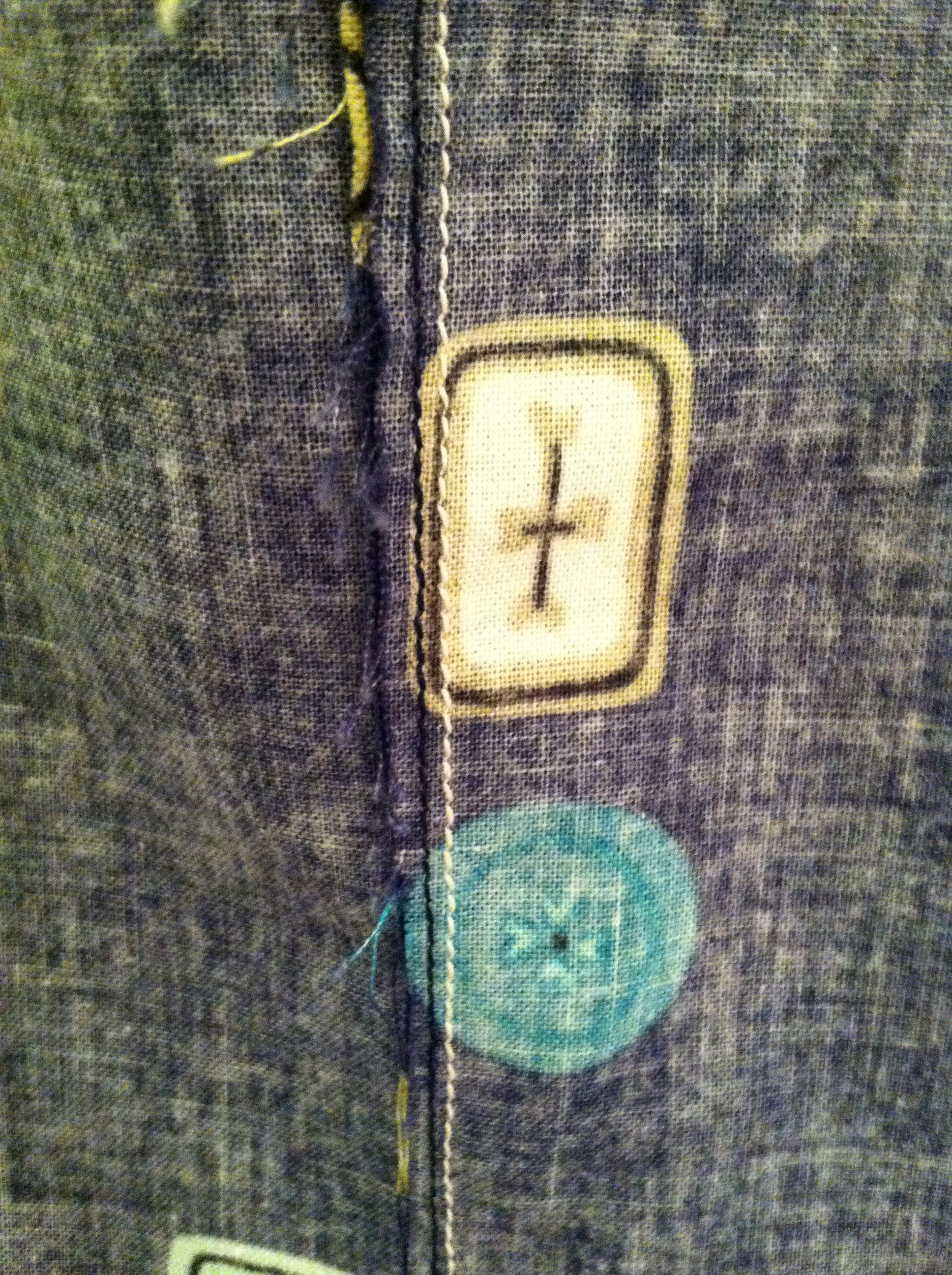 This time, I modified the pattern to use the contrasting fabric just on the inside of the garment. I used Rae’s instructions as if I was going to do a contrasting button placket using the standard measurements on the side with the buttons and then on the side with the button holes, I made the green portion wider and the pink portion narrower adding a seam allowance to each, folding the fabric at the seam where the two fabrics are sewn together, a technique I use for most of my hems. I am really happy with how it turned out. I think the pink on the outside was a little bolder than I wanted to go but I love the way it peeks out. In order to make Mary Poppins and Bert upright, I had to piece the placket facing but I think it came out fine. Waste not want not! The people are sideways on the hem facing which was necessary given the long strip that I needed for the hem facing.