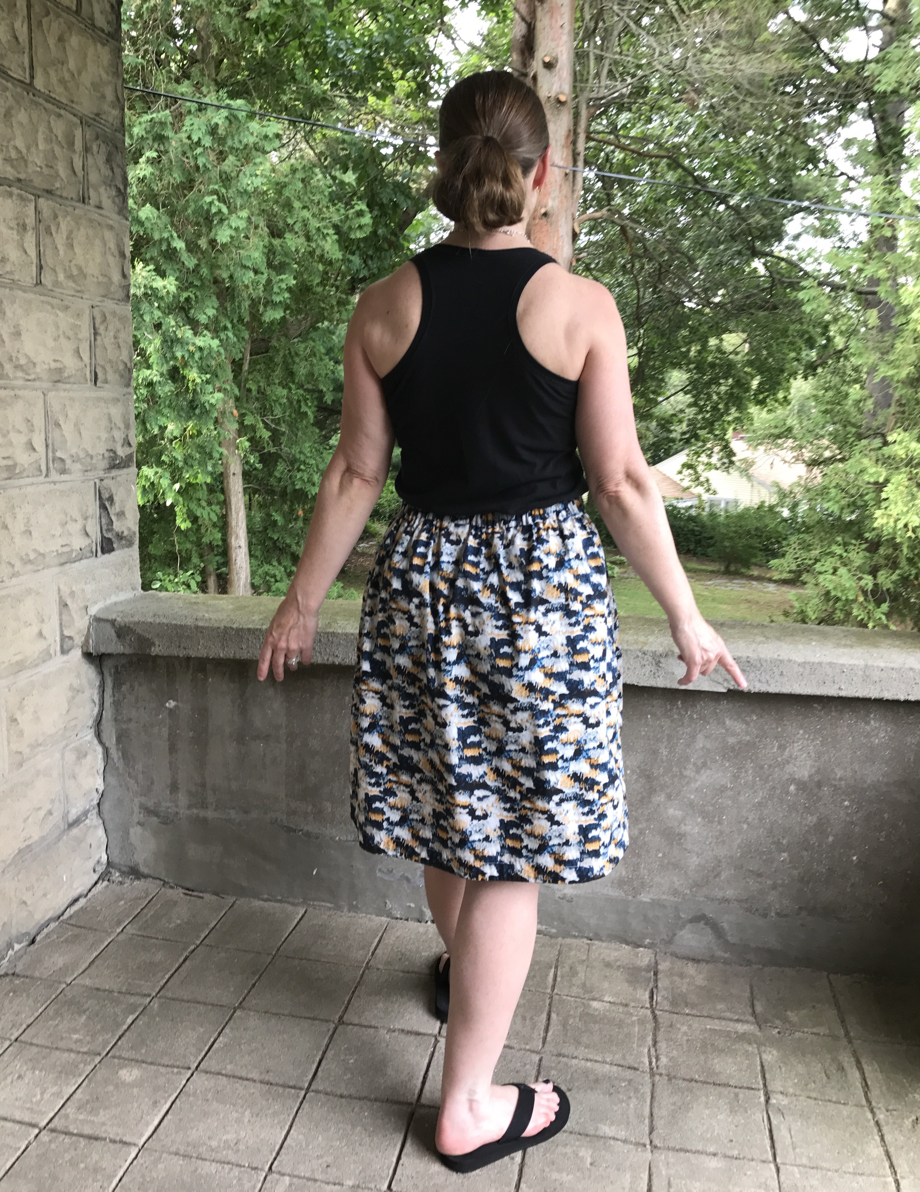 This is my most recent Cleo skirt. It is made with a beautiful voile by Sharon Holland. I also made an Isla Knit Dress in the blue colorway of the same fabric. The design really spoke to me.Here it is worn with a black double gauze MBR Gemma Tank left untucked and blowing in the breeze: