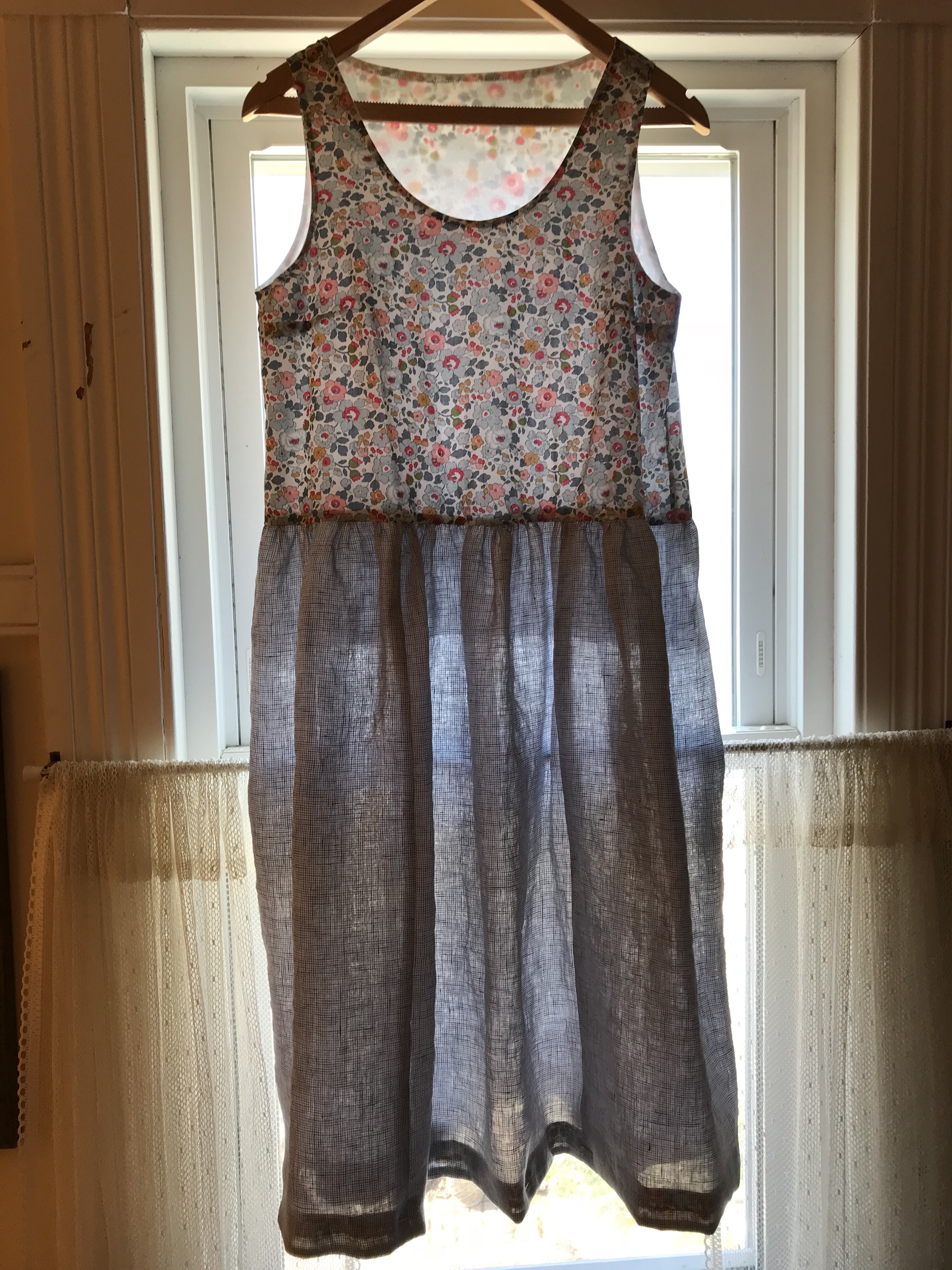 The Liberty and Linen version was basically finished over the winter but I still hadn’t handsewn the lining to the waist, partially because I must have cut the two bodices slightly differently and things didn’t line up for me the way they usually do which threw me off. But I finally sewed everything in late April and it is ready to wear. It is a little sack like but I think will be nice for hotter days or with a jeans jacket or cardigan for cooler days. A good summer date night dress. Maybe a little bare for work although wearing a lab coat makes many less wearable options wearable. I bought the linen last spring and also made  a Josephine blouse with the same fabrics.