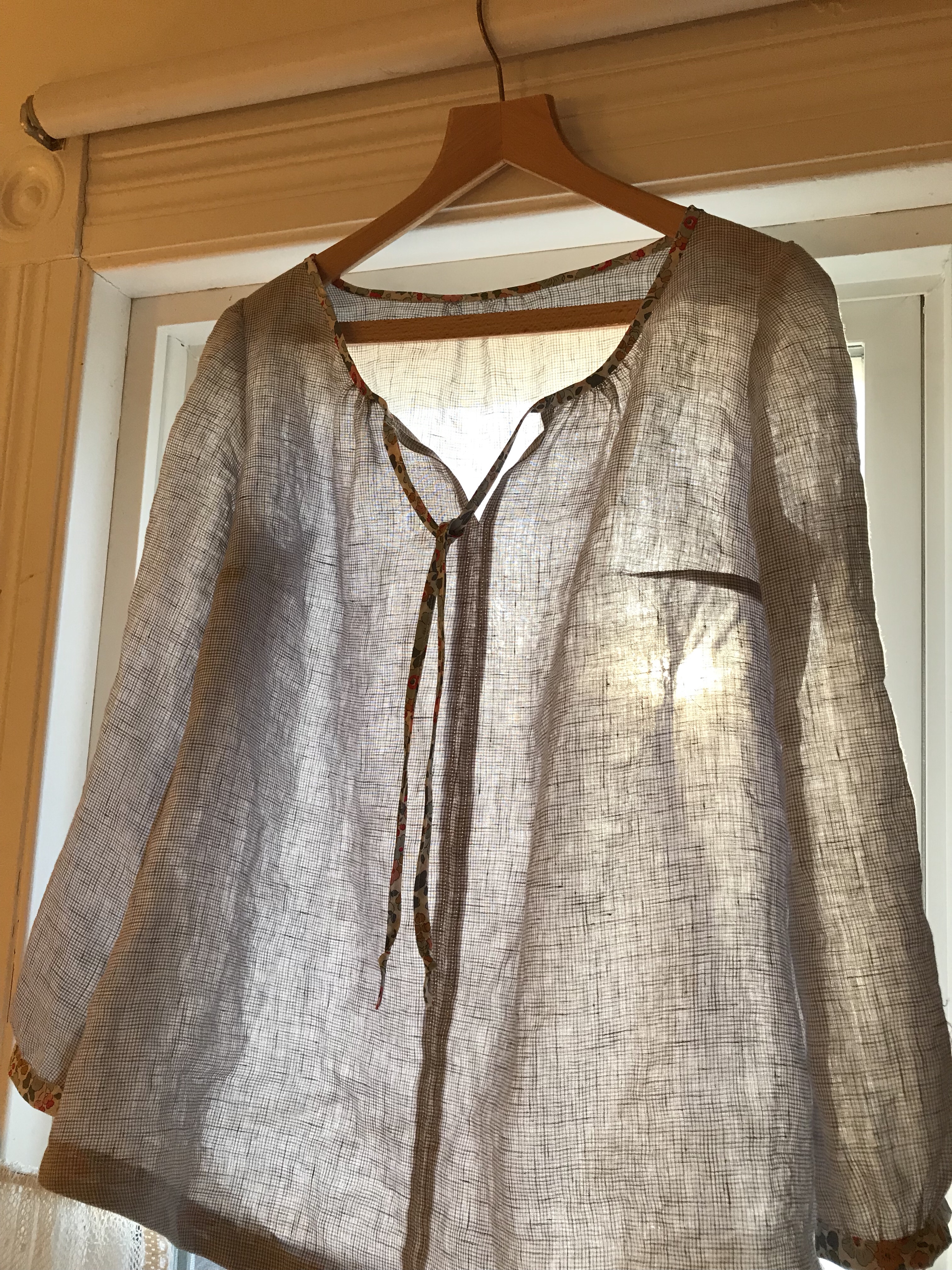 I had already started making a version of the Josephine Blouse by Made By Rae in this Loominous fabric when I saw a version of the Roscoe blouse on instagram with contrasting neck and sleeve binding and that was it. I had a vision of a boho blouse in linen with a Liberty floral trim. I had already purchased this lightweight Telio linen checked fabric and I realized that this Liberty lawn would be perfect. Both fabrics from fabric.com. (I plan to also make the Roscoe at a later date but will be making it in rayon.)The Josephine is usually made with pleats but Rae posted a version with gathers that is the perfect Boho Blouse. It is loose and cute but shaped with bust darts. Many of the other styles such as the Roscoe have raglan sleeves and need a really flow-ey fabric such as rayon but the Josephine’s slimmer profile works well in cotton and in linen. It is less full cut and the gathers are more controlled. Rae suggests using elastic thread but I find that I have more control with my two rows of gather stitches. The linen is so crinkly that the gathers don’t have to be perfect and it still looks good.The actually cutting and sewing of the pattern is very straightforward. The front is sewn together and the back is one piece cut on the fold. You gather the fabric in the center back and the center of the two front pieces. You cut the two mirror halves of the front, one back piece and two sleeves. I then made the bias binding and two rectangles to make cuffs. I usually stitch just on the edge of the cuff, not in the ditch. I like the look of the visible stitching.I have to say I was thrilled with how this turned out. I used bias strips of Liberty as hem facings, as one does.Finished blouse below. It is finally warm enough for front door pictures.My sewing room has one window that faces west. Such beautiful light.I had enough of these two fabrics to also make a version of the Gemma tank cropped with a gathered linen skirt. This dress is going to be perfect for spring. More late afternoon light. I can’t get enough of it after a long, dark winter.