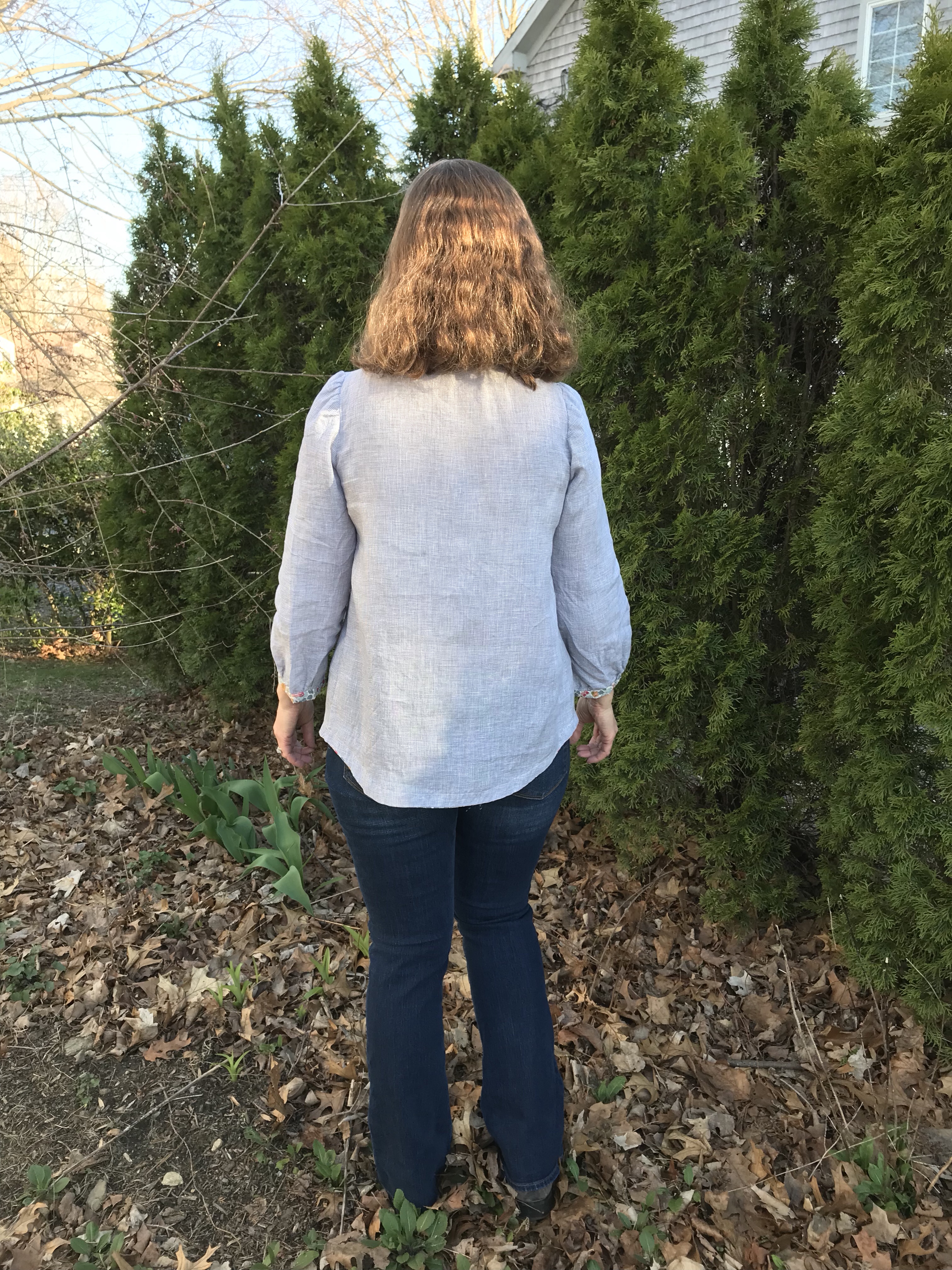 And many pictures of the blouse as worn. This is going to be in frequent rotation. I love the neckline. Rae is a genius with necklines.img_9738I used the curved hem from the Gemma tank as my guide for this hem. I love how you can mix and match Rae’s patterns. Back view.The other side view.I look as though I am summoning the backyard spirits but I think my husband caught me on the way to fix my hair and put it behind my ears.As you can see in the next picture. He takes a zillion pictures and then I whittle them down to a few. What can I say? Perfect combination of pattern and fabrics. The Loominous version is going to be great too. Almost finished! Spring sewing is officially underway.