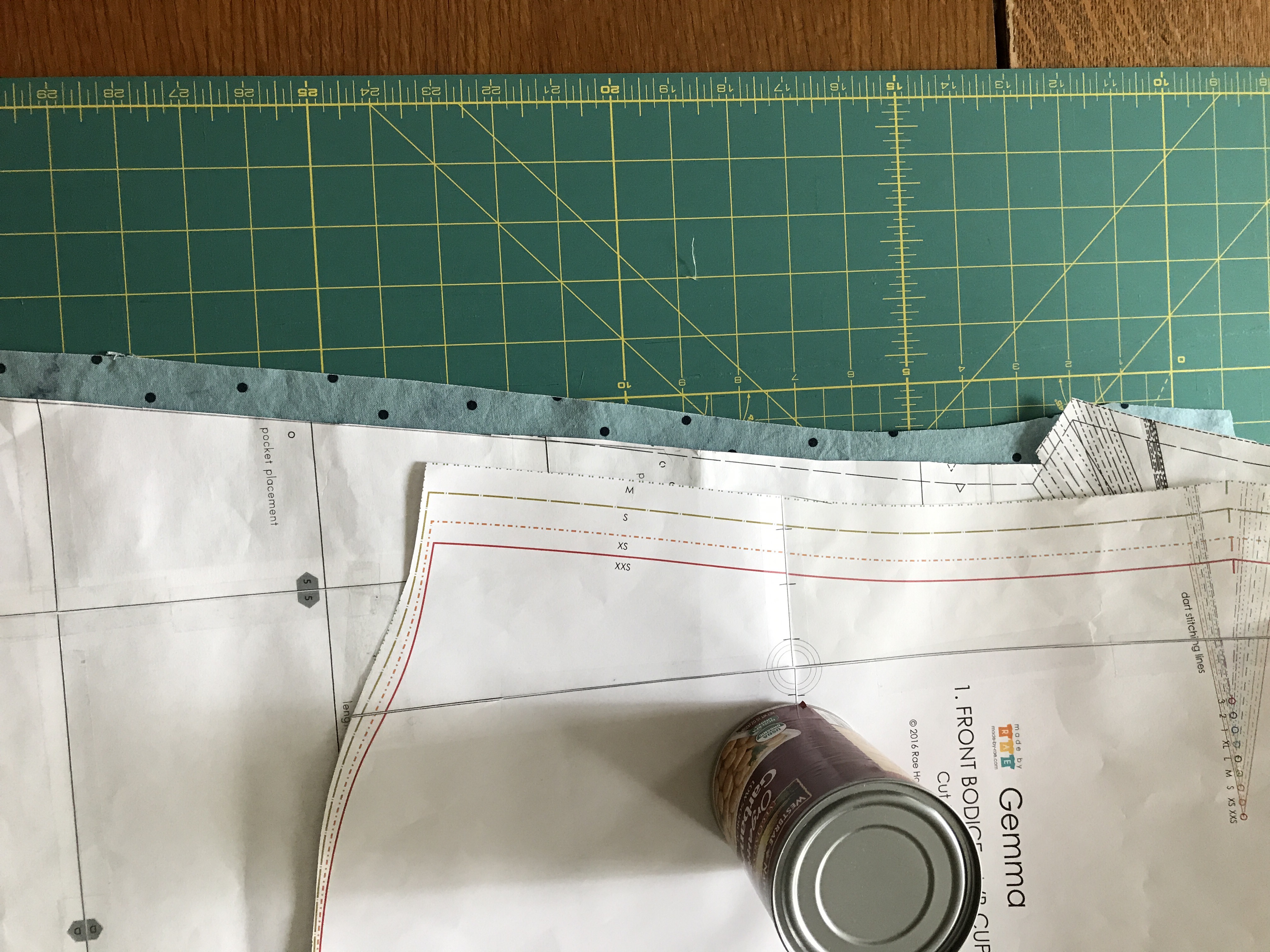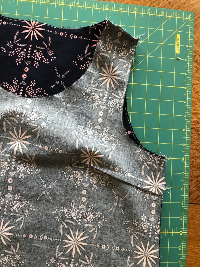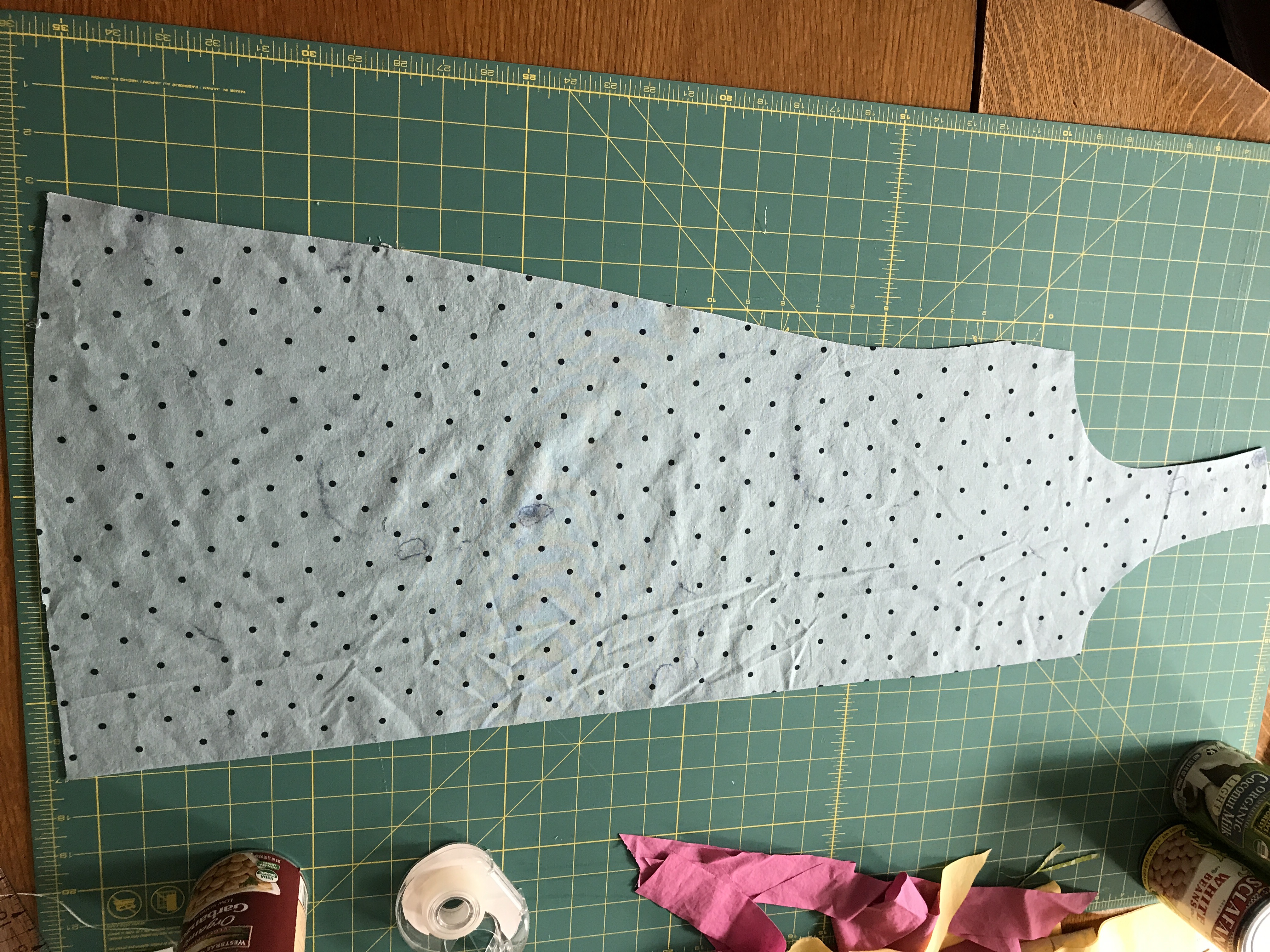 Based on the instructions, my measurements put me in a size Large and given my 5’9” height, Helen’s directions suggest adding 1.5 inches to the pattern by adding 1/2 an inch in three separate places. But when I lined up the version I had already made, it was much smaller than the new pattern that I had printed out and pieced together and in particular, the straps were shorter in my first version and I was pretty happy with where the upper part of the skirt hit my torso on version one. I actually think with my long torso it is sometimes more flattering to have the waist of the garment hit a little higher than my natural waist. So despite the really wonderful, logical instructions, I did not add any length to the straps of the pattern and just cut the pattern out between the M and L lines except for the straps which I cut on the M line at the top and the L lines along the armholes to add a bit of width to the straps. Since the new printed pattern was so much longer than the version I had already sewn, I just cut along the L hem line and decided to sew it up and see what happened. As I did with version 1, I drew a new curve for the neckline about half-way between the two versions of the pattern.
