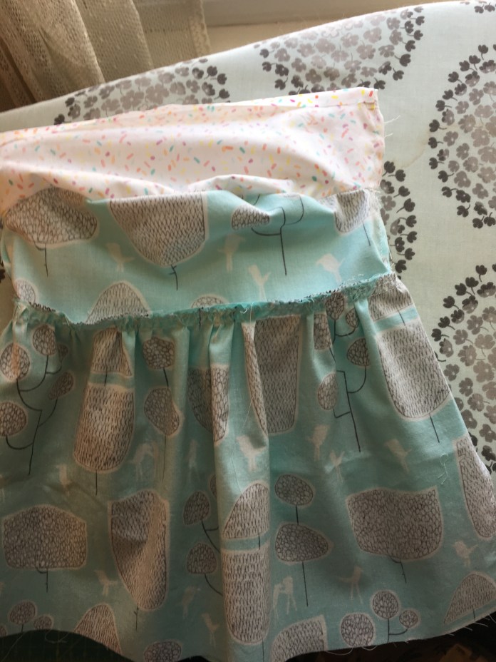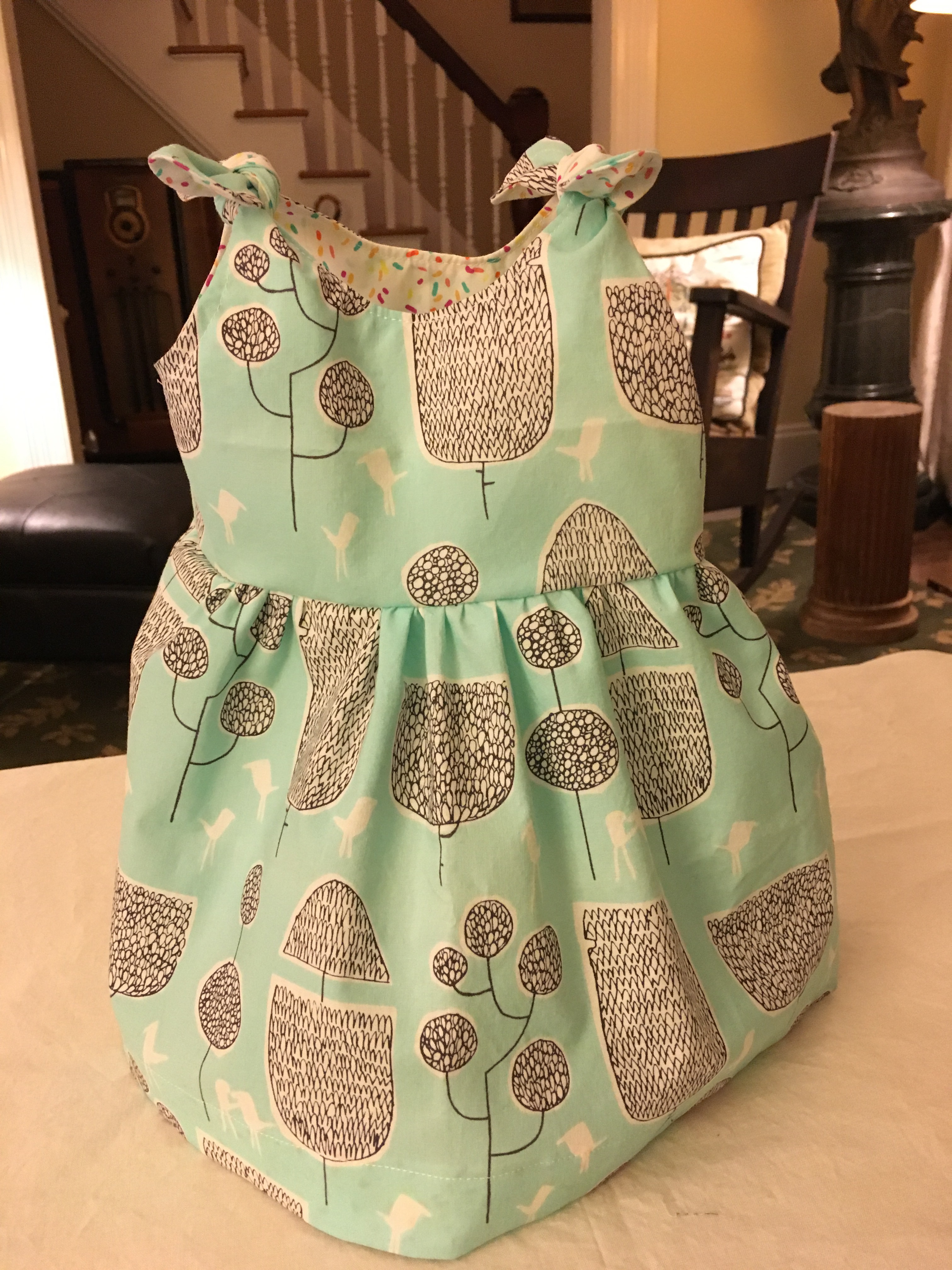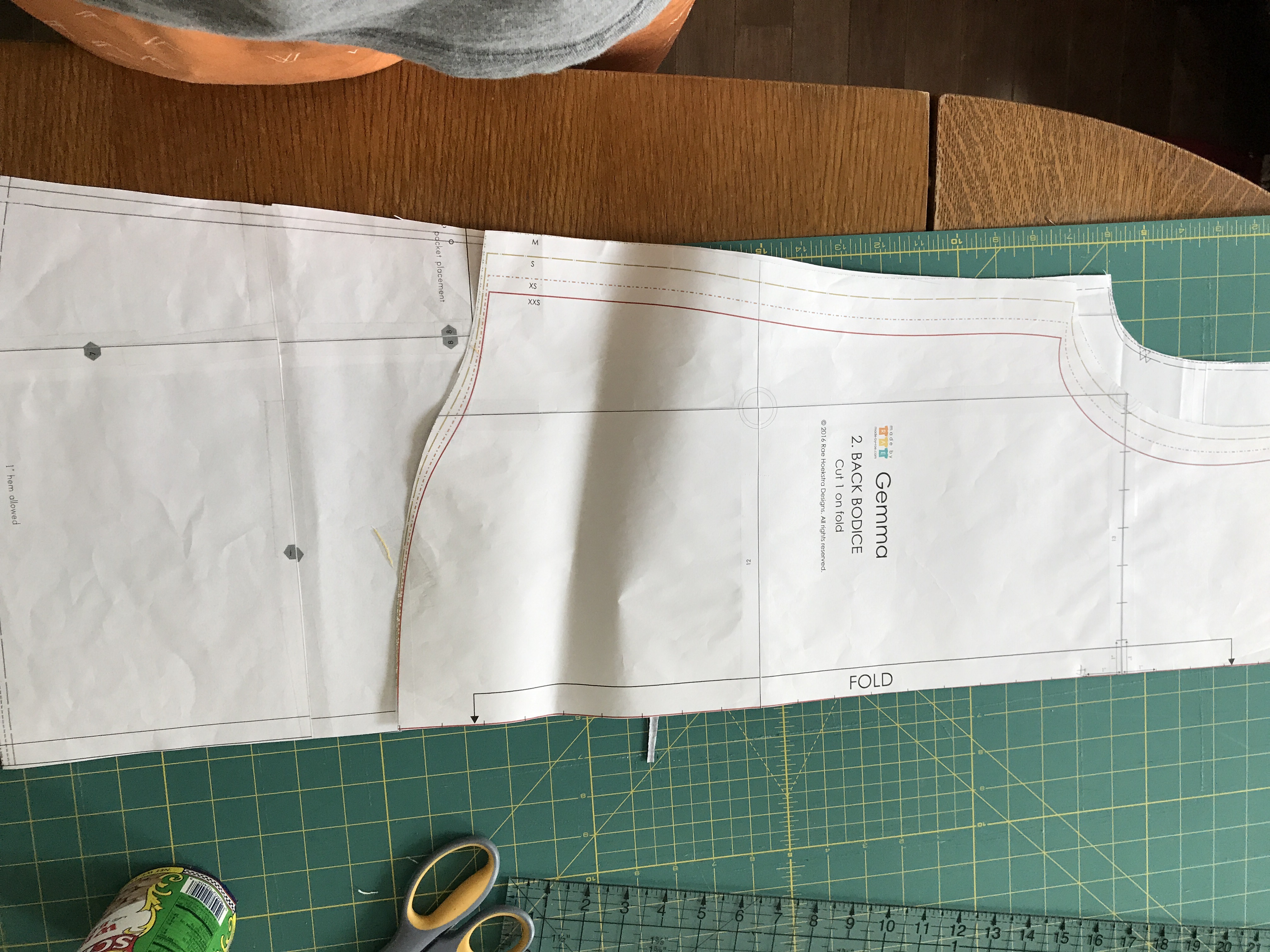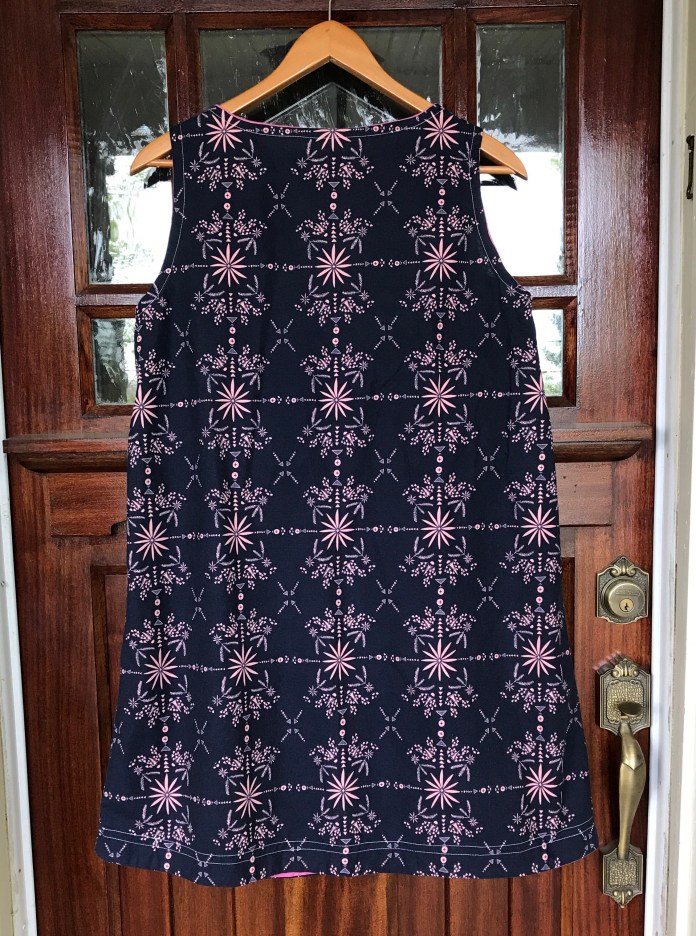 Based on the instructions, my measurements put me in a size Large and given my 5’9” height, Helen’s directions suggest adding 1.5 inches to the pattern by adding 1/2 an inch in three separate places. But when I lined up the version I had already made, it was much smaller than the new pattern that I had printed out and pieced together and in particular, the straps were shorter in my first version and I was pretty happy with where the upper part of the skirt hit my torso on version one. I actually think with my long torso it is sometimes more flattering to have the waist of the garment hit a little higher than my natural waist. So despite the really wonderful, logical instructions, I did not add any length to the straps of the pattern and just cut the pattern out between the M and L lines except for the straps which I cut on the M line at the top and the L lines along the armholes to add a bit of width to the straps. Since the new printed pattern was so much longer than the version I had already sewn, I just cut along the L hem line and decided to sew it up and see what happened. As I did with version 1, I drew a new curve for the neckline about half-way between the two versions of the pattern.