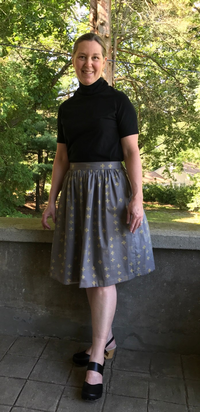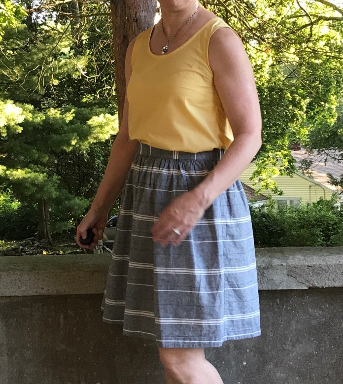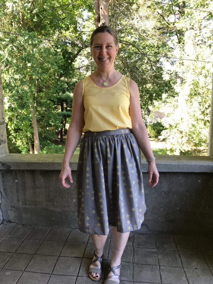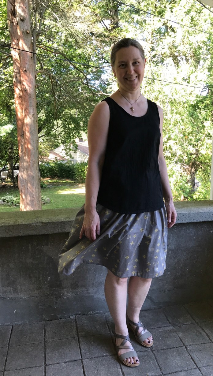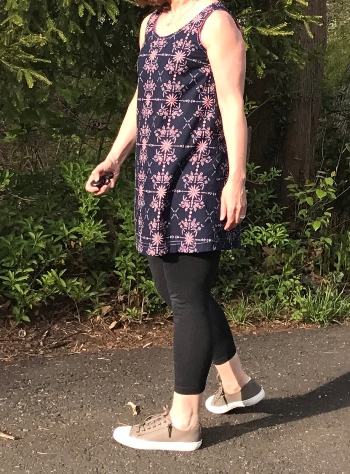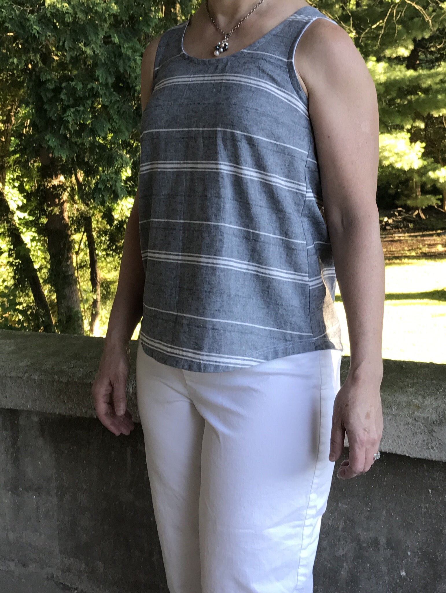 I decided to go for broke and sew French seams even though they always take more than 5/8 inch when I sew them (I have a hard time enclosing all the fraying edges with the 1/4 and 3/8 seams used to create French seams as Helen instructs in the pattern. I ended up sewing a 3/8 seam with wrong sides together and then a 1/2 inch seam with right sides together since it seemed as though I would have lot of extra width. The finished version was longer than version one as planned but even with my 7/8 inch French seams, it was also more roomy. It did not completely make sense but I figured I must have made more adjustments than I realized with my first version- it was such a blur. I tried on version 2 and took pictures. I liked it but did not love it because the linen-cotton blend I used for version 2 was more stiff than the linen I used for version 1 and I felt that overall, the finished garment was less flattering. Here it is with another favorite Gemma tank. I used quilting cotton for the top-stitching to accent the design features and this version had pockets but I didn’t like it as much because it was bigger and didn’t drape as nicely and felt a bit more dowdy.