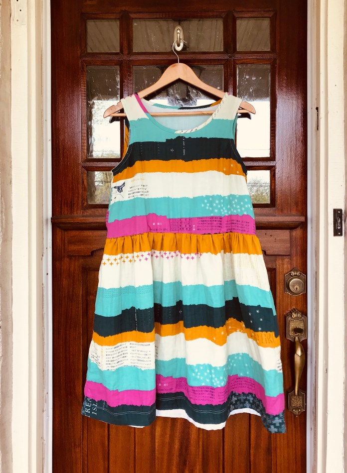 I saved the best for last. I have loved this Cotton and Steel double gauze fabric since I first saw Rae’s Beatrix Blouse. At the time, the price per yard just seemed too much for me but I kept thinking about it and not buying it and then it was basically sold out everywhere and then one day, lo and behold, I found it on sale. I bought 2 yards thinking that I would make a Beatrix Blouse but I didn’t get around to it and then last year when I saw the Gemma with Ruffles, I had the idea to make this dress. I love everything about it. I sort of pattern-matched the sides of the skirt. I didn’t have enough fabric to really pattern-match the bodice but I don’t think it matters. I used two different techniques when I bound the neck and armholes. The binding is visible around the neck and turned under for the armholes. Ribbon bra straps are sewn in because I remembered just in time! One of these days I am going to thread a bunch of snaps on ribbon and have them precut in a dish on my sewing table because you can sew them in right when you add the bias binding. Really easy and it makes wearing tank tops so much easier.